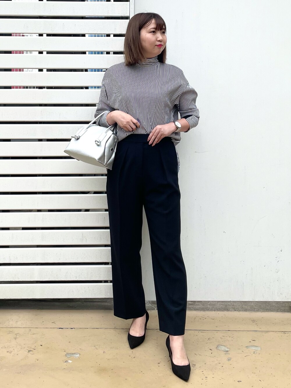 モノトーンコーディネート!ストライプのシャツは大人気のストライプワンピース×バックボタンシャツを組み合わせたアイテム。サラッとした着心地でシワになりにくい素材でお仕事にピッタリ◎袖は半分リブ入っており、腕まくりもピタッと止まってくれるのが嬉しいポイント!パンツはSANYO ENJINとのコラボアイテム!形はストレートで、ウエストのサイドにゴムが入っていて履き心地抜群の美シルエットパンツ!きれいめにもカジュアルにも履ける万能パンツです◎