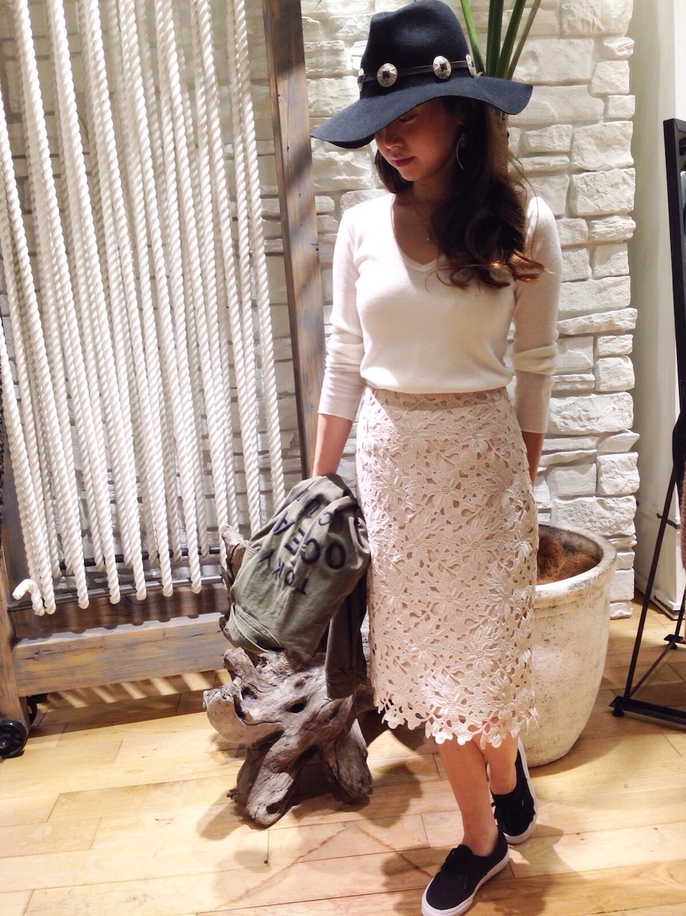 花柄カットワークタイトスカート! タイトスカートをVANSと合わせてカジュアルコーディネイトにしてみました。丈はひざ丈になっていて、シルエットがとてもきれいです。大柄のお花のレースなので、シックにもカジュアルにもマルチにお使いいただける一枚となっております。 シューズ VANS¥5.500+tax ジャケット planet blue world\16.000+tax