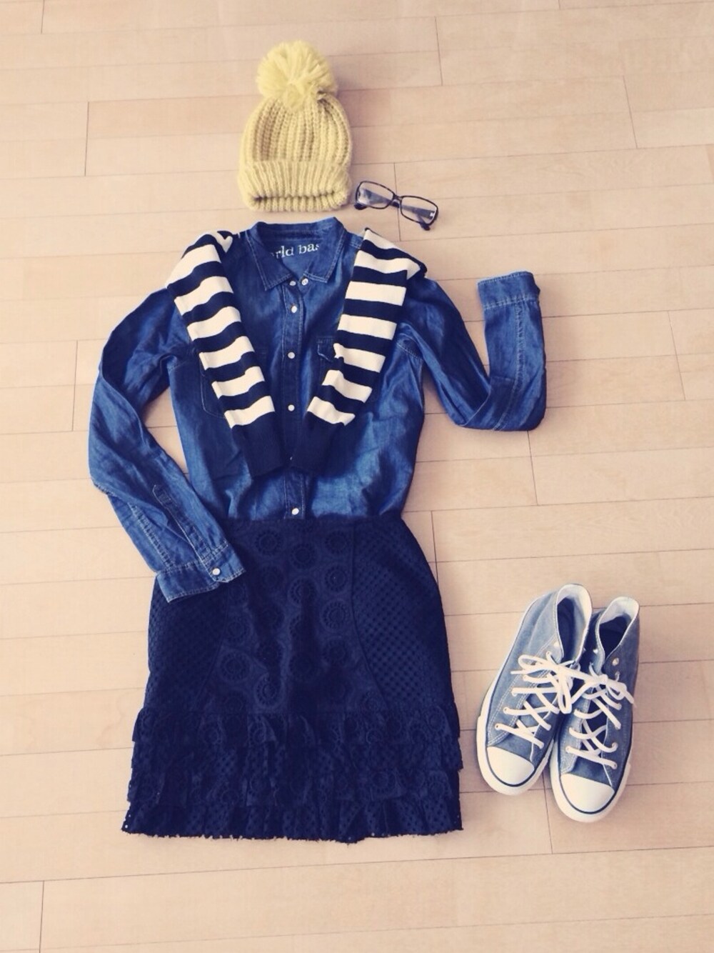 デニムシャツにカーディガンを プロデューサー掛け◎