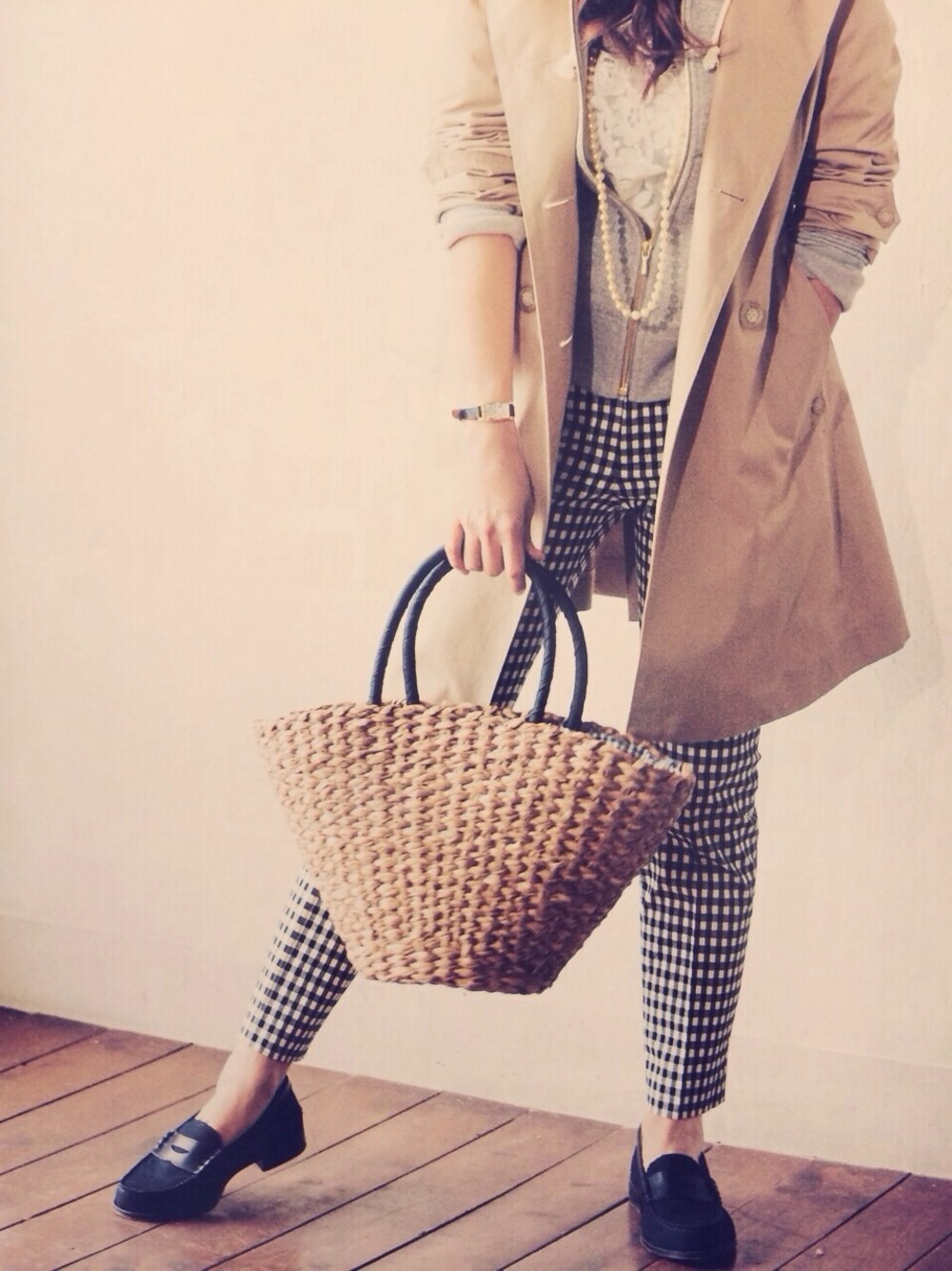 春にしたいCoordinate 春コート(トレンチ) グレーパーカー パール かごバッグ ギンガムチェックパンツ ローファー