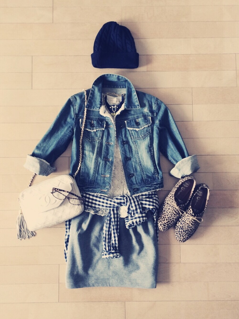 ✴︎デニムジャケット&ニット帽&靴 は同じで着回しコーデ その2✴︎ 白いレースのインナーと 白いビンテージシャネルのバッグで ちょっと爽やかさを意識してみました◎