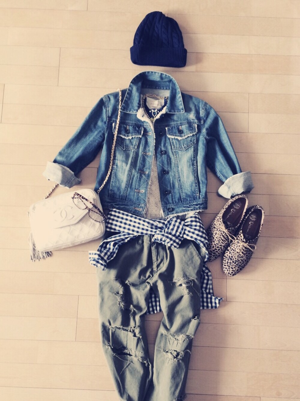 ✴︎デニムジャケット&ニット帽&靴 は同じで着回しコーデ その3✴︎ スカートとダメージチノ、 どちらが良いか悩み中です◎