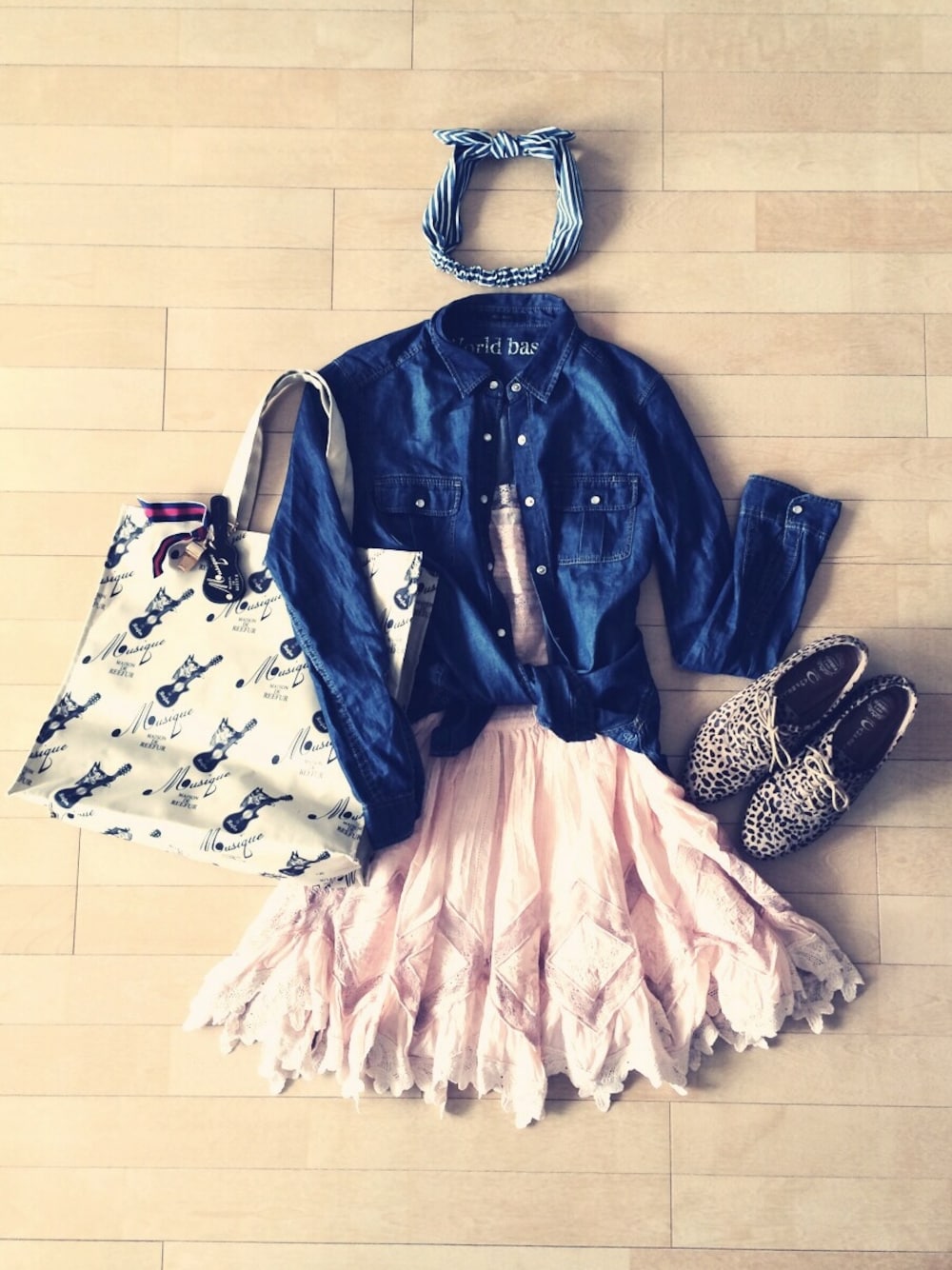 春らしいNINEのワンピース◎ デニムシャツとデニム素材のヘアバンドで ワンピのガーリーさを少し抑えてみました◎