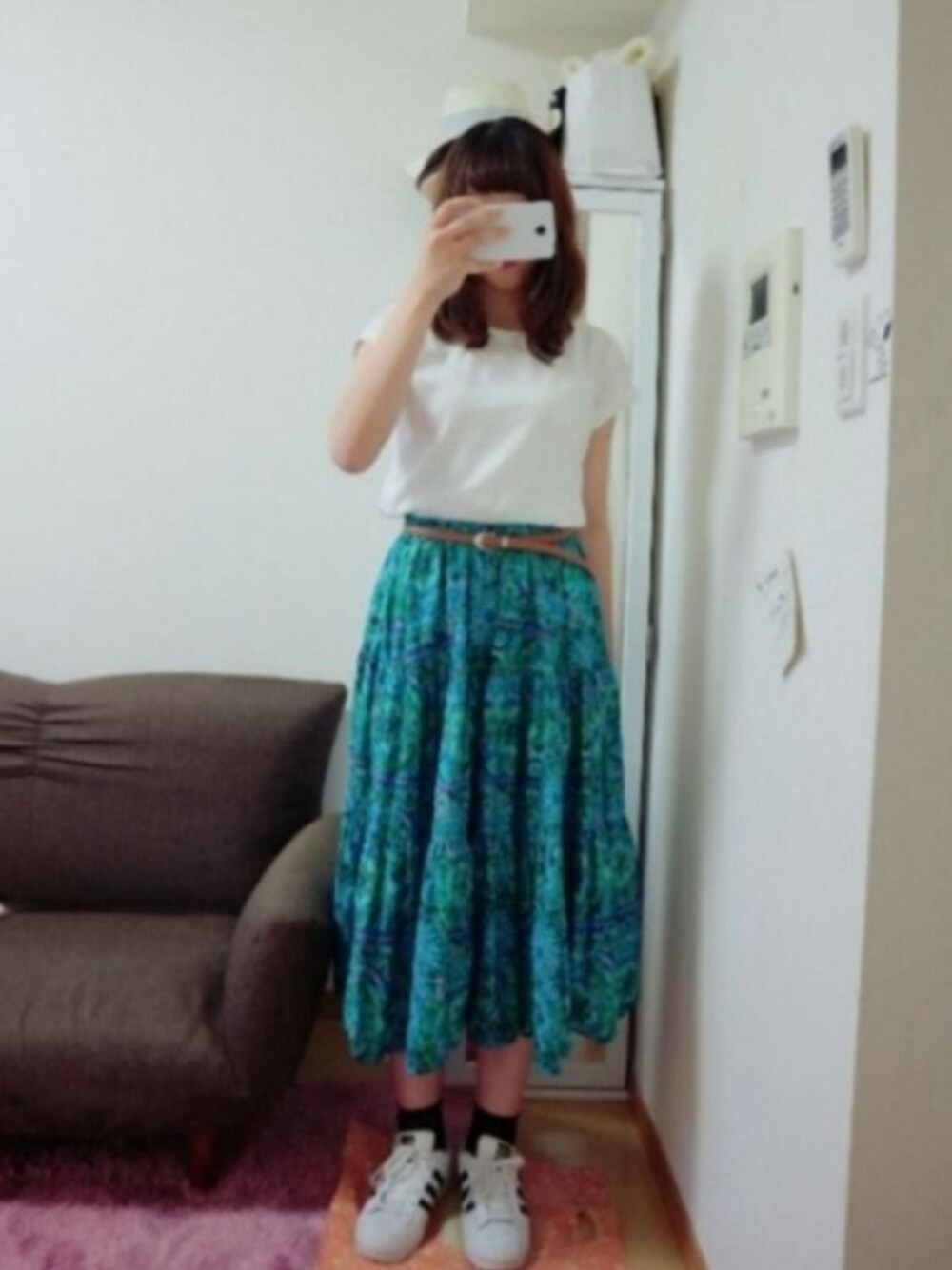 今日はちょっとだけ暑いです。 古着屋さんで購入したスカートは 夏らしさが全面的に出てて可愛いんだけど 私の住んでる地域ではまだ早いのかな〜と。 そう思いつつ、サンダルではなく スニーカーで出かけました。