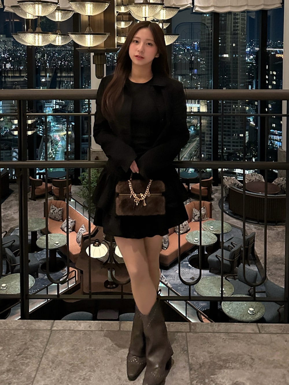 ブラウン系のバッグ、グレー系のブーツ、ブラック系のジャケット/アウターを着用したレディースの秋コーディネートの2枚目の写真