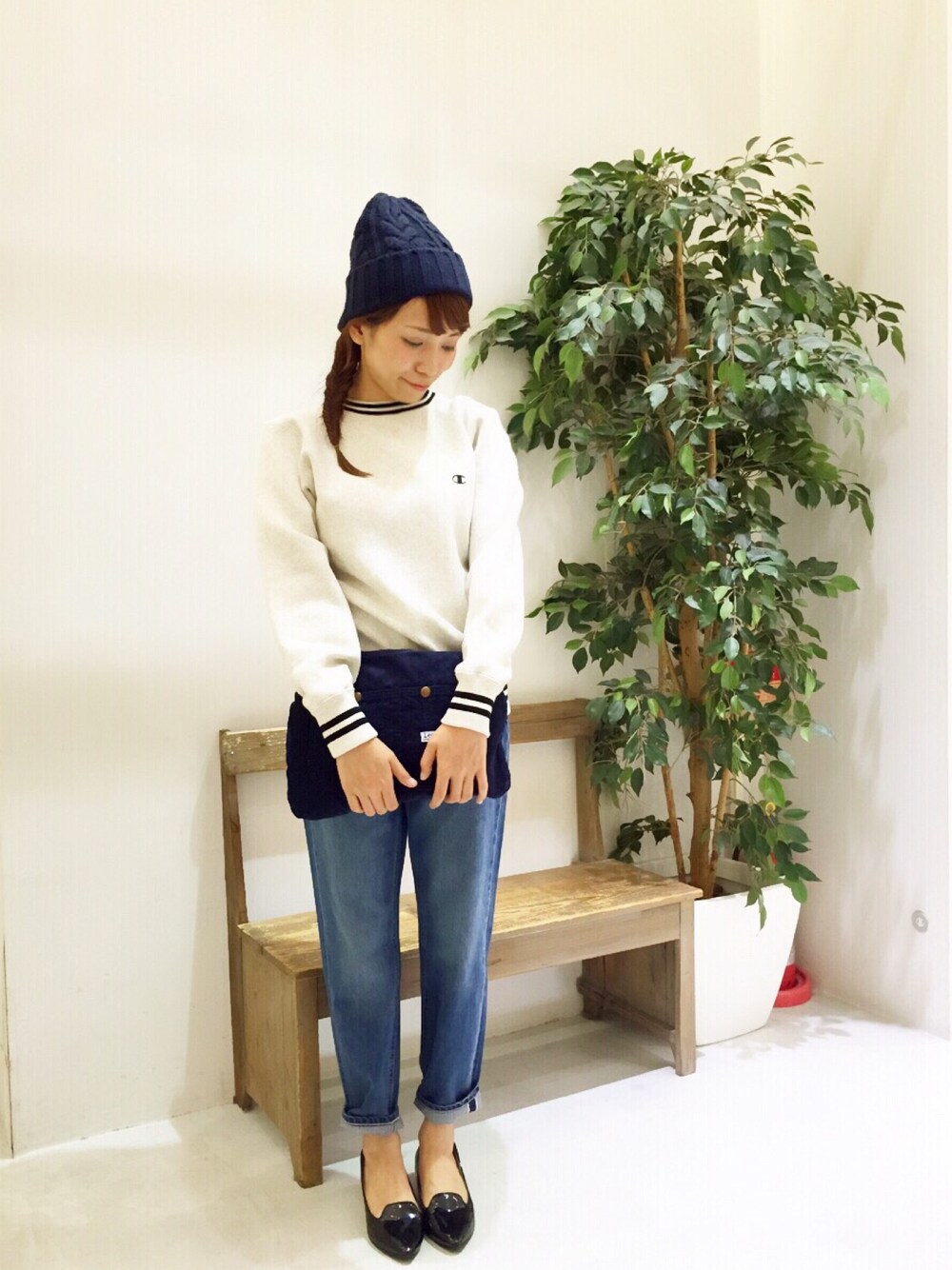 チャンピオンのスウェットにデニムでシンプルなカジュアルコーデ。 首元、袖、裾にラインがあり、シックな配色なのでどんなコーディネートにもマッチします。