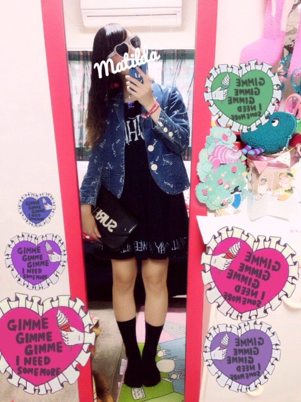 初めてのコメント乁( ˙ ω˙乁)!こんにちは! 全体を黒でまとめてるけど、着崩した感を出したかったから、上にデニム生地で柄物のジャケットを(ง ˙o˙)วイヤリングのさくらんぼと腕のヘアゴムを赤にしてちょっとポップに!