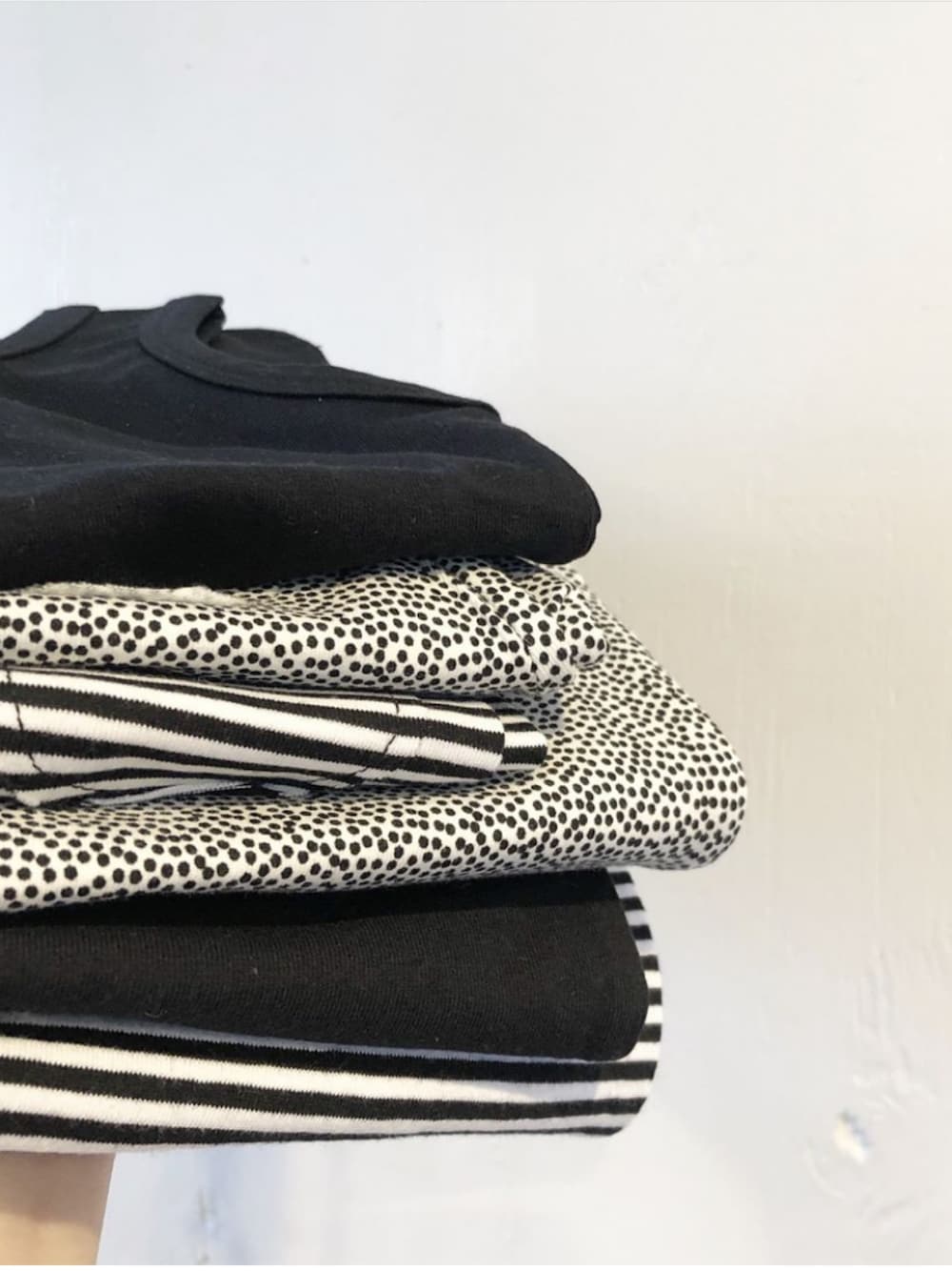 mingo.19ss . BASICSも♡ . サイズアップする度に揃えたい♡ . . . black dot b/w stripes . singlet¥2800+tax T-shirt¥4000+tax legging¥4200+tax slim fit jogger¥6100+tax . . . .