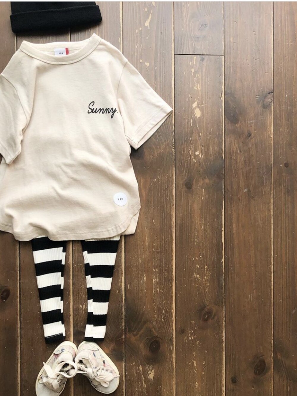 本日、雨の日なのでご来店のお客様は5%off☔️ . ご来店の際はお足元にお気をつけお越しください💓 . . fov . シンプルでプチプラなので学校や保育園用にも🙆♀️ . . 90〜大人サイズまであるので家族みんなでお揃いできます🙆♀️💓 . . fov sunnyTシャツ¥1760 s(90-100) m(110-120) L(130-140) XL(150-160) free(160-170) サンド.ベージュ.チャコールグレー . ボーダーリブレギンス¥1650 110.140 . . . .
