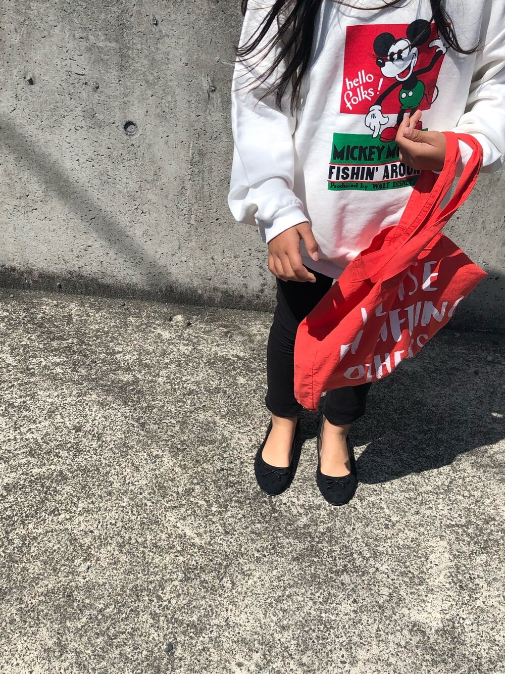 ミッキースウェット、肌寒い日にぴったり👍💓 まだ少しあります👌 . ミッキースウェット¥3190 90.100.110.140.150 モデル身長128cm、140着用 . インナーのTシャツは fov STATE Tシャツ¥1760 s.m.l.xl.free モデル身長128cm、XL着用 . バッグ¥2200 . . . .