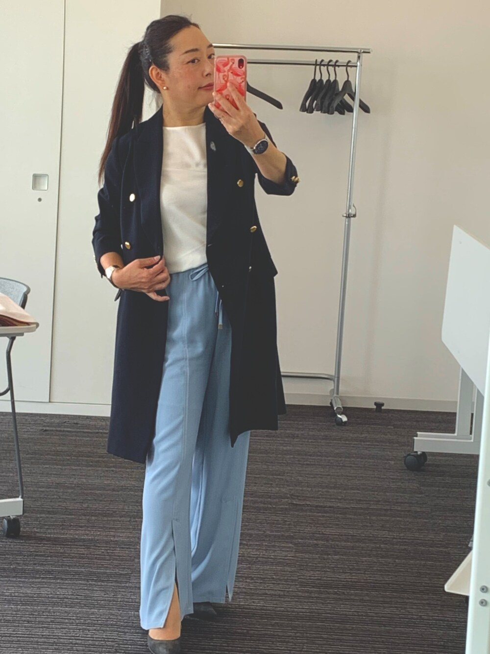 ロングジャケット、好きだなぁ パンツは画像ではわかりずらいですが白のステッチが入ってます。 前のスリットも揺れる感じが好き