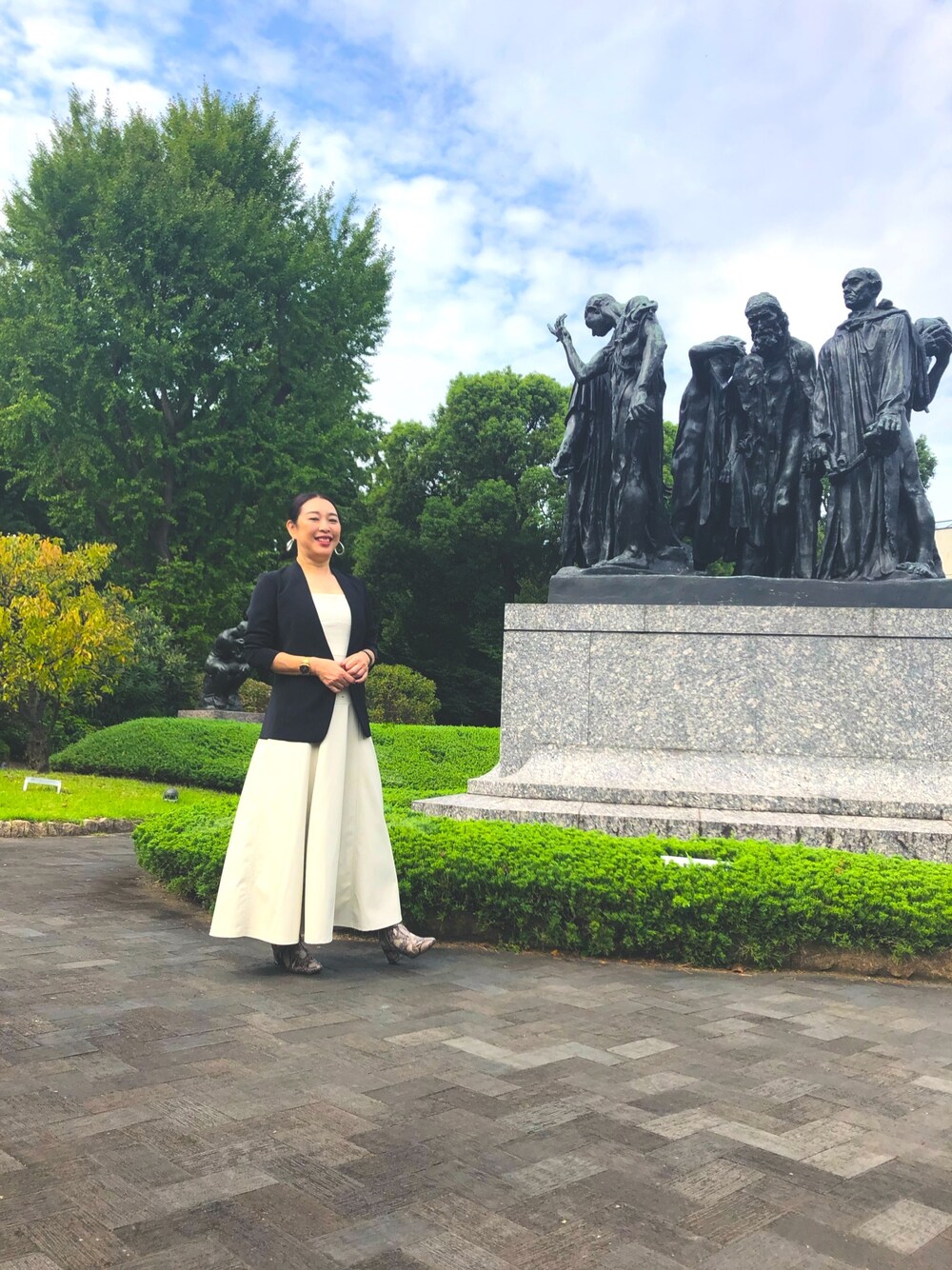 去年の秋口、フェイクレザーのワンピースを着てました。 長めジャケットだからスカート部分の広がりも抑えられるので気にならない