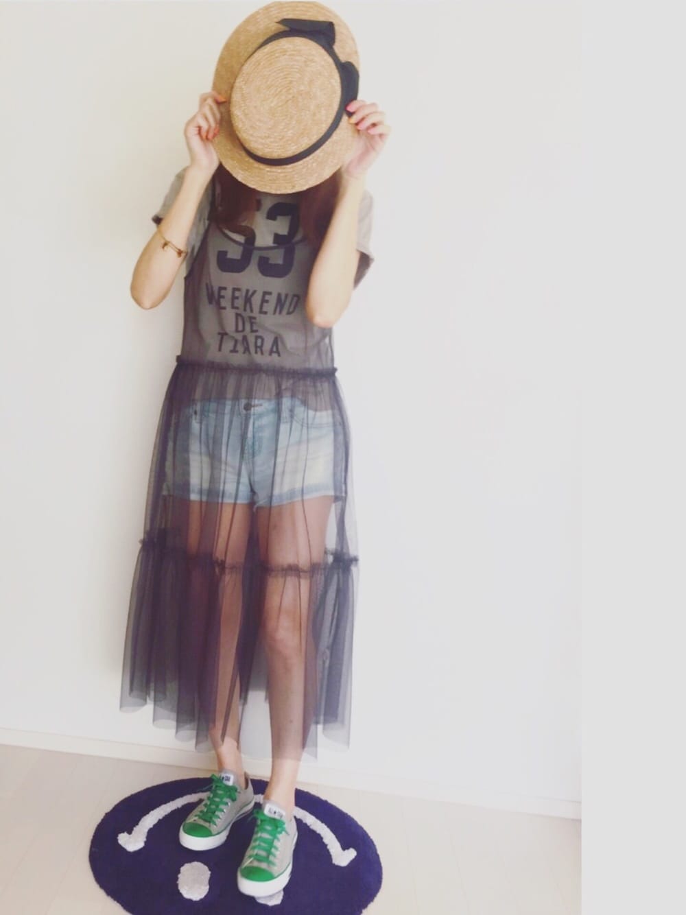 チュールワンピ×ショーパン 足元はデッドストックのオールスター。 グリーン/グレーのコンビが可愛くて♡ チュールワンピはいろんなコーデが楽しめそう♪