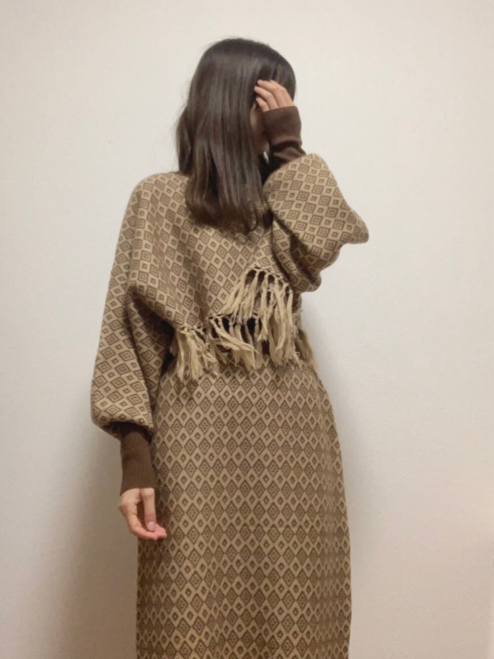 I_amのジャカードフリンジニットとスカートのセットアップ♡ 軽くて着やすくて、着回しがたくさんできそう‼︎ スカートは大股で歩けないけどかなりかわいい…♡
