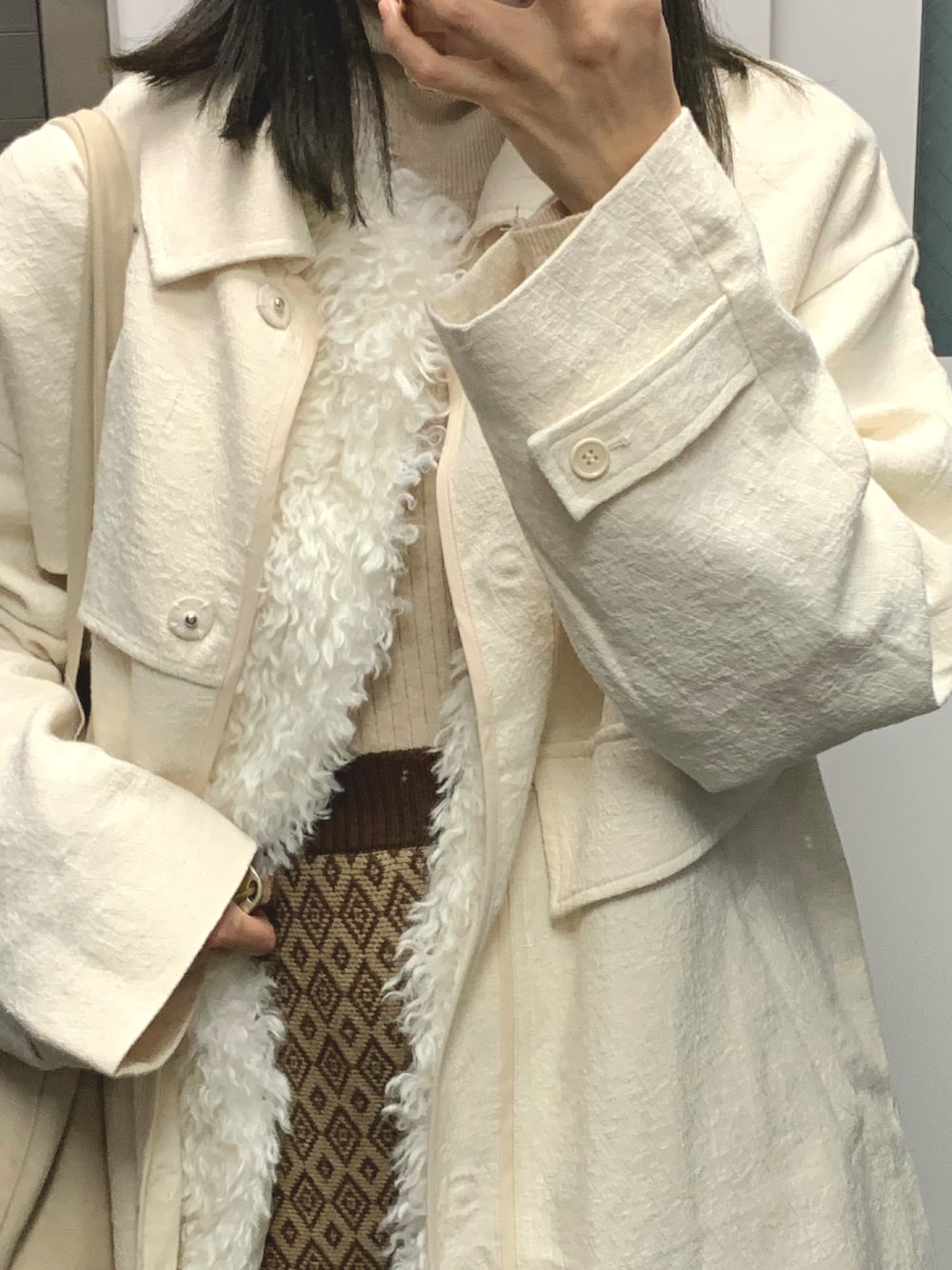 ホワイト系のコートかわいい☺️ ふわふわベストはほんとにあったかくて寒い時にありがたい…‼︎❄︎