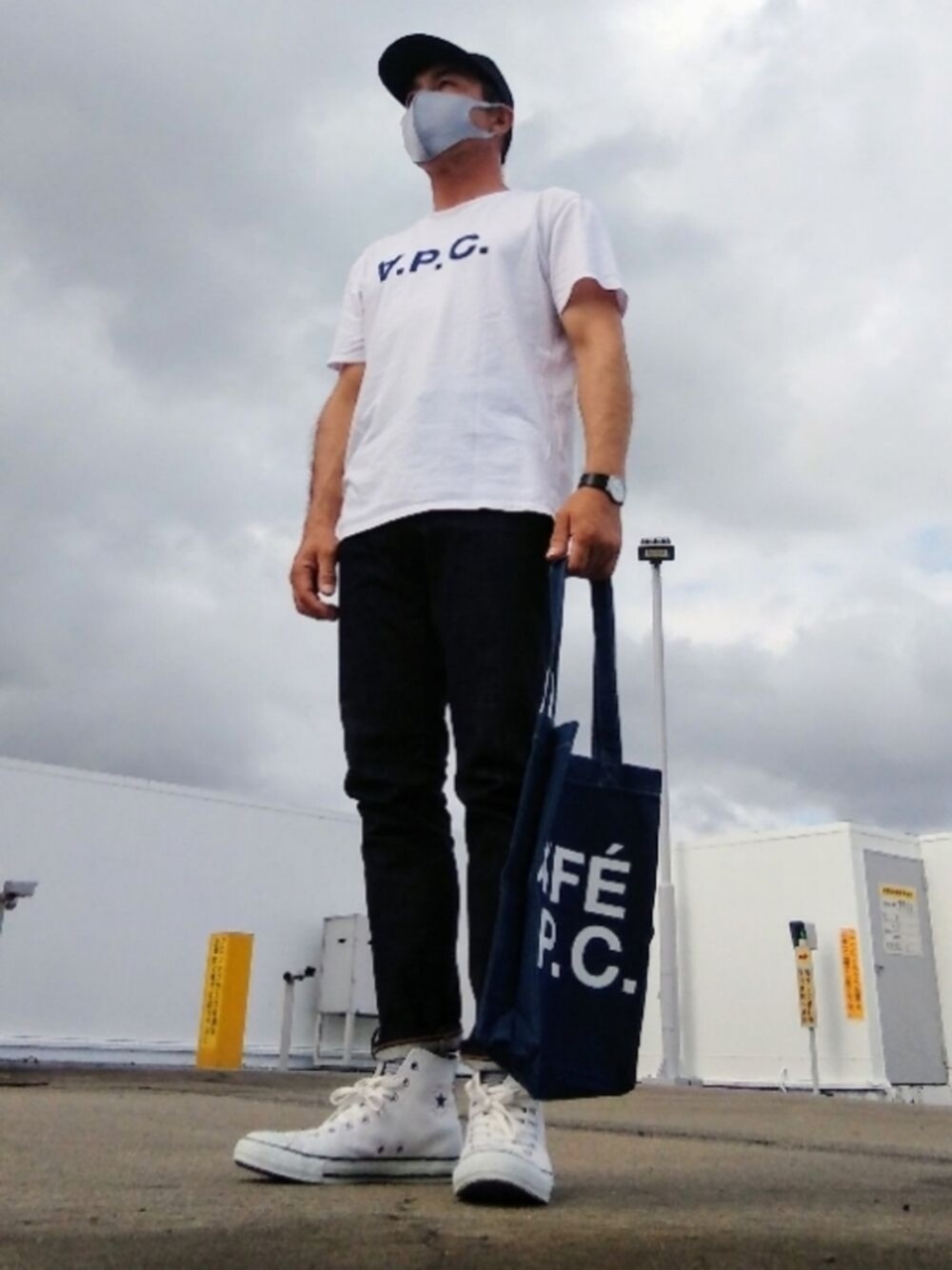 こんにちわ☺ 暑い日々が続き熱中症対策 してください✋ 今回は夏コーデにしました🍀 A.P.Ctシャツ・トートバッグ デニムパンツなど自分が好きなブランドにしました🙇 キャップはダイトンマークが さりげないようにして足元に コンバートレザーハイカット白を組み合わせてみました🍀