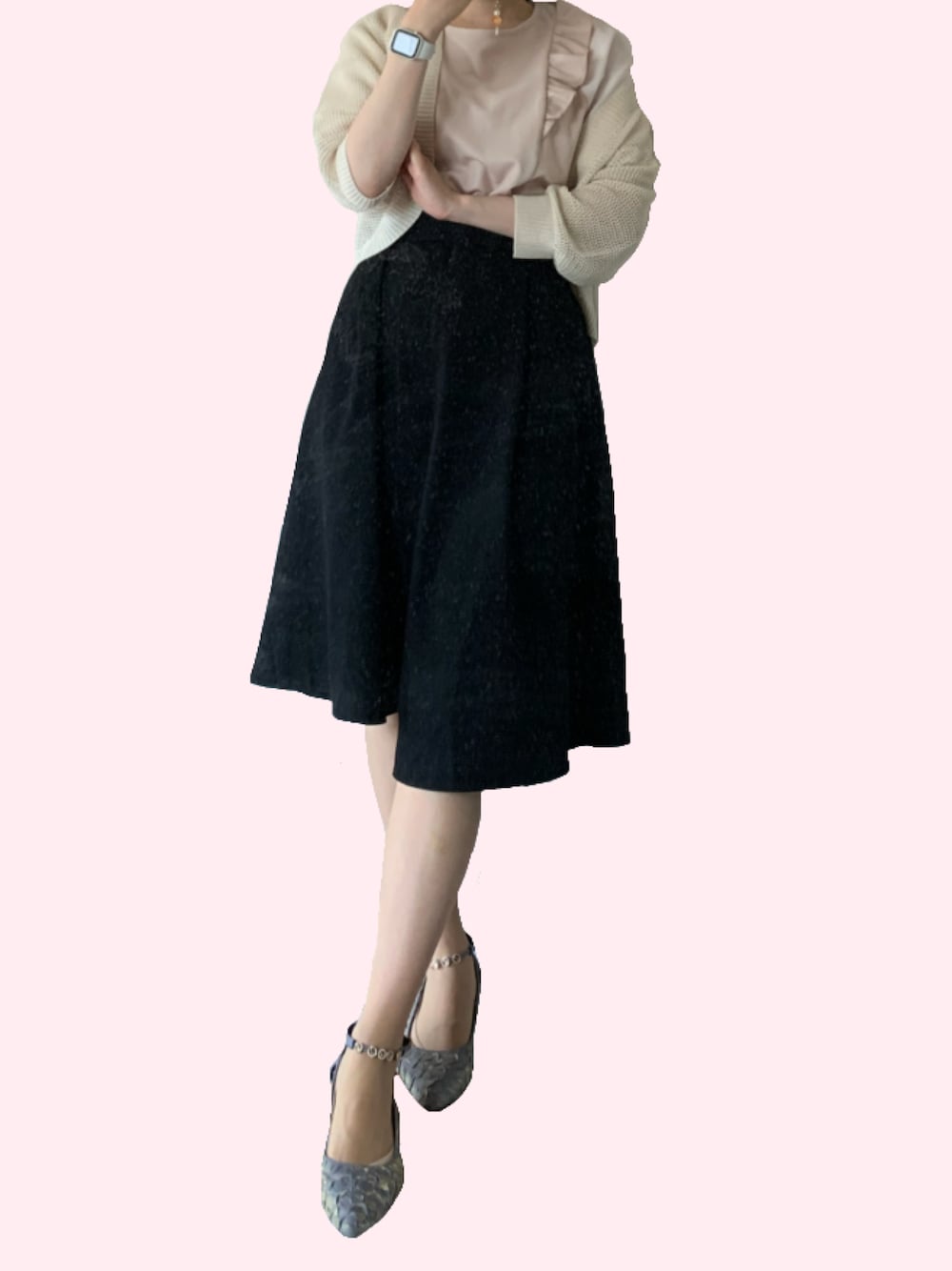 SHEINで「ラインストーンデコレーションテクスチャー ポイントトゥチャンキーヒール アンクルストラップ パンプス」って調べると出ます。今日これで足をくじきました。