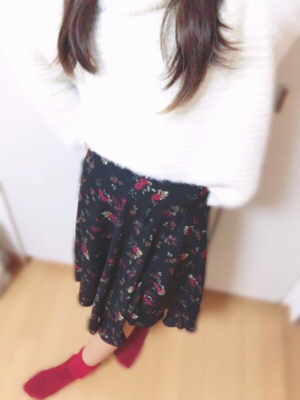 このスカートは丈の長さが前・横・後ろ全部違っててかわいい!!オススメです 🤙 黒のトップスと合わせるとキレイ目にまとまります(^ν^)