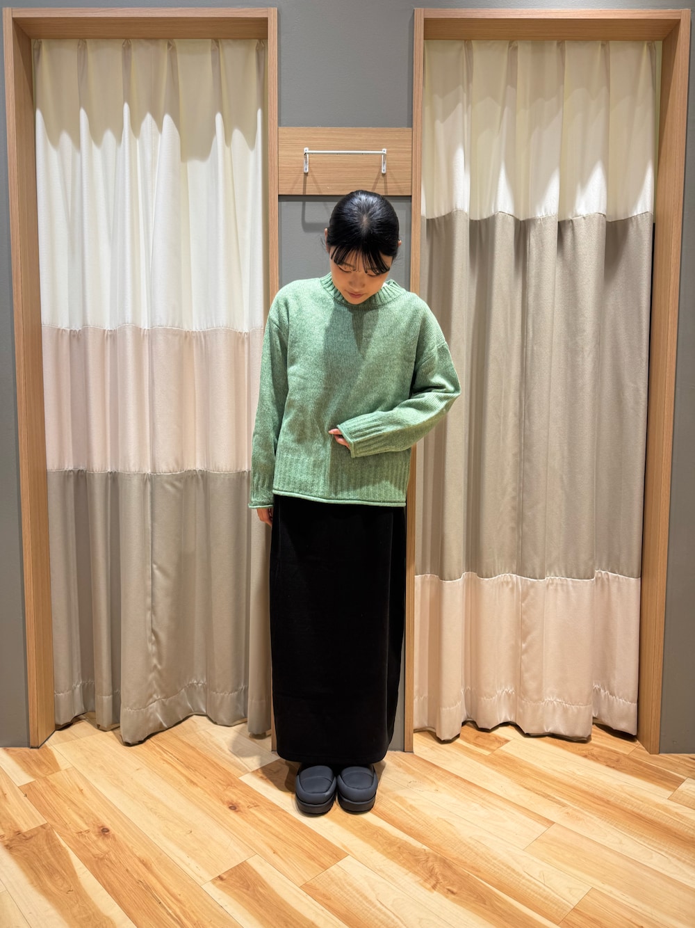 ご覧頂きありがとうございます⟡.· タイトスカートにグリーンのニットを合わせてみました🧶🦖⋆͛ スカートは吸湿発熱素材が使用されているので 寒くなってきた今の時期でも着用可能です🙆🏻♀️◎ ウエストはゴムになっているので穿き心地⌣̈👍🏻 ̖́- ニットはもちもちとしたニットなので着心地👌🏻 シンプルですがアクセントにもなるアイテムです🌿