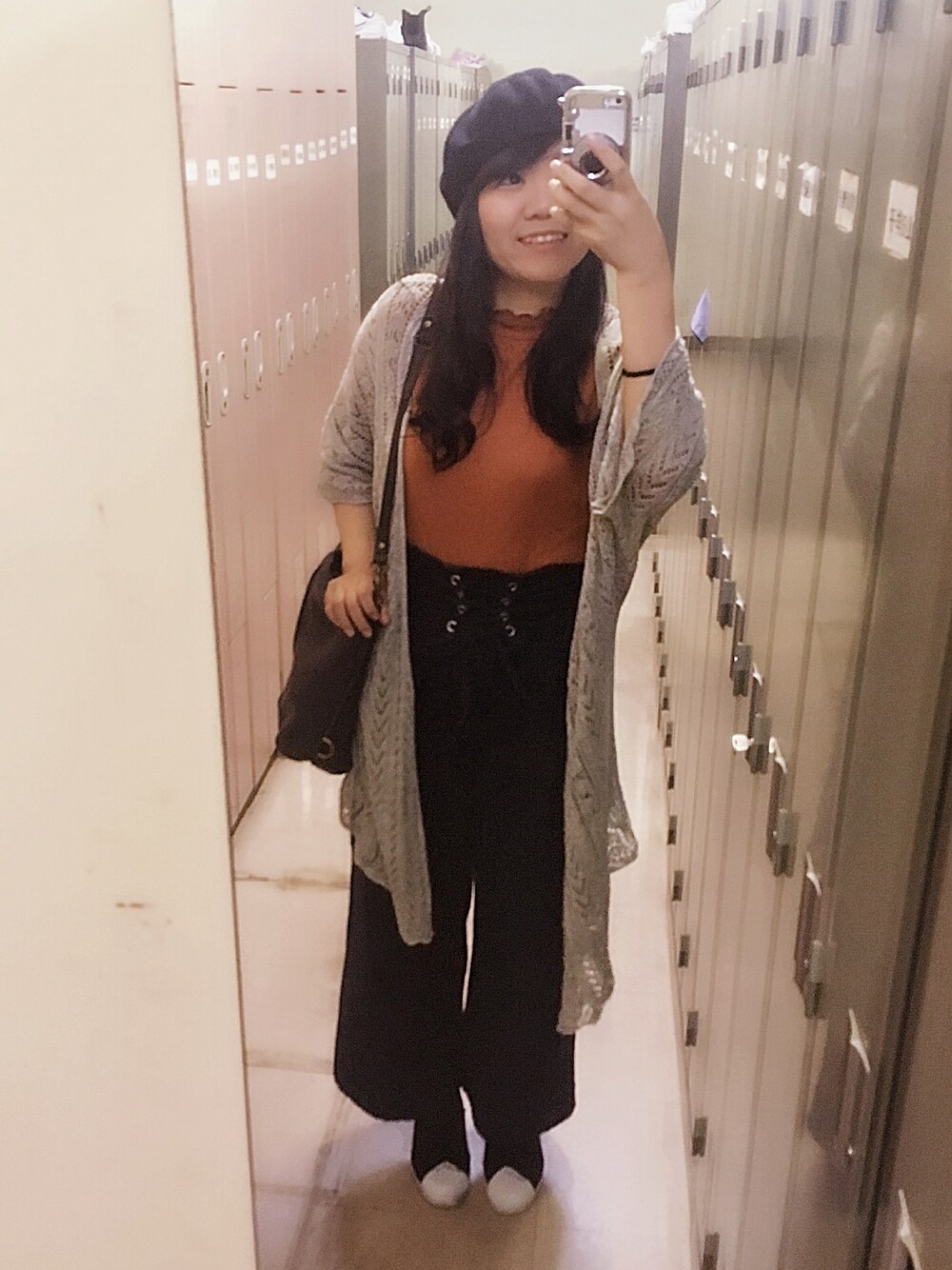 しまむら上下にSM2のロングカーディガン。 足元はスニーカー。 マスタードカラーとベレー帽で秋感漂わせたつもりですねん。