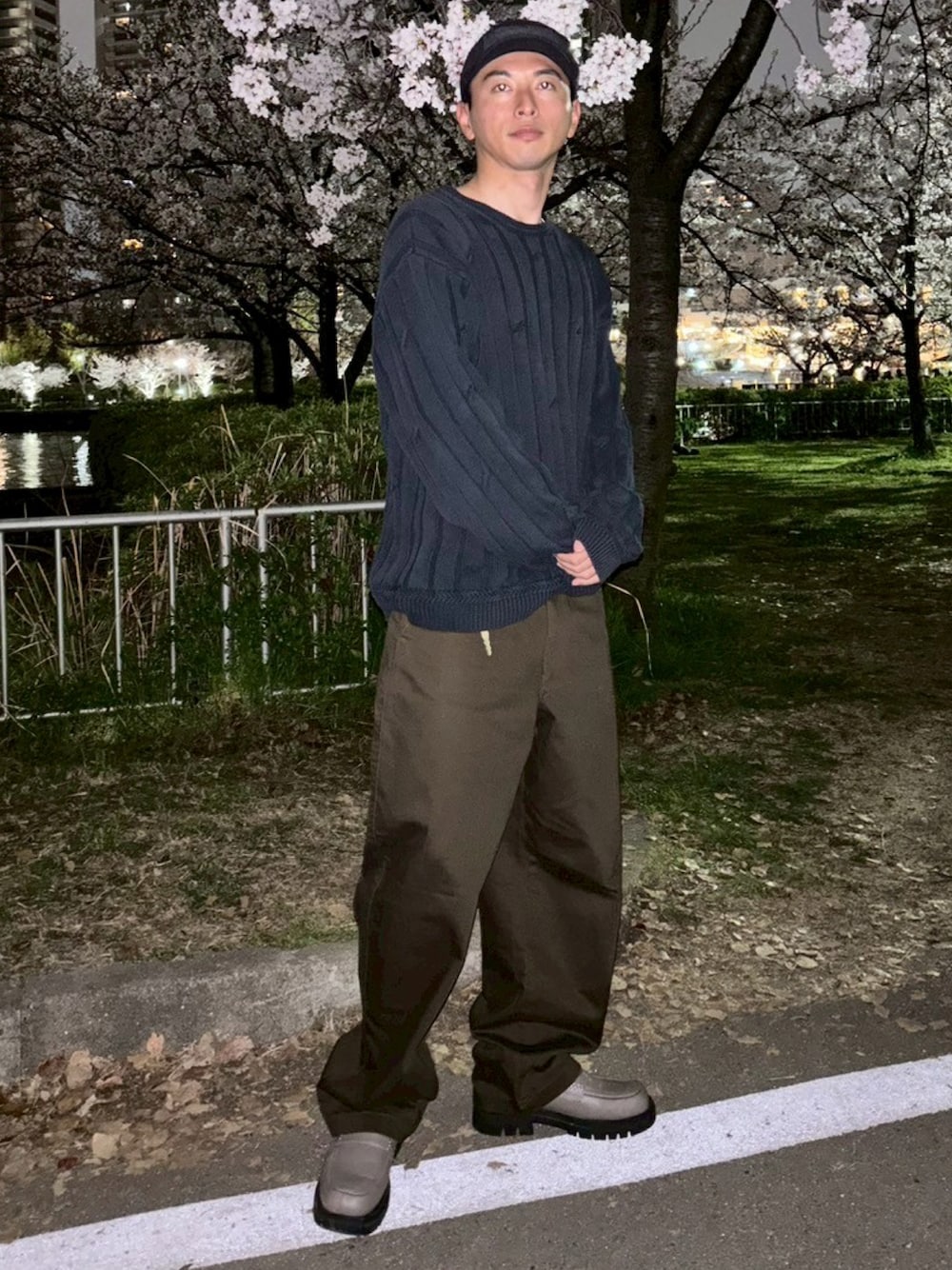 UNIQLOのワイドフィットチノの靴に溜まる感じと光沢が調子良い👍 トップスはオーバー目に、あえて肩落ち気味なニットが好みの合わせ💙