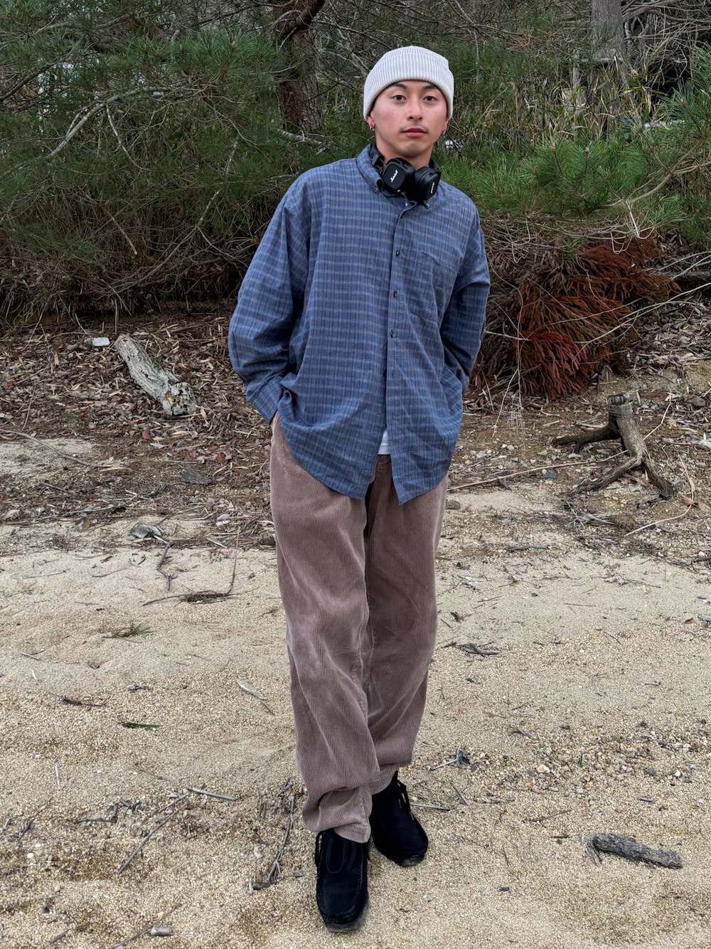 シャツ×ビーニー×ヘッドホンの組み合わせが手堅くイケてる! 靴は派手じゃ無い方が雰囲気出る!