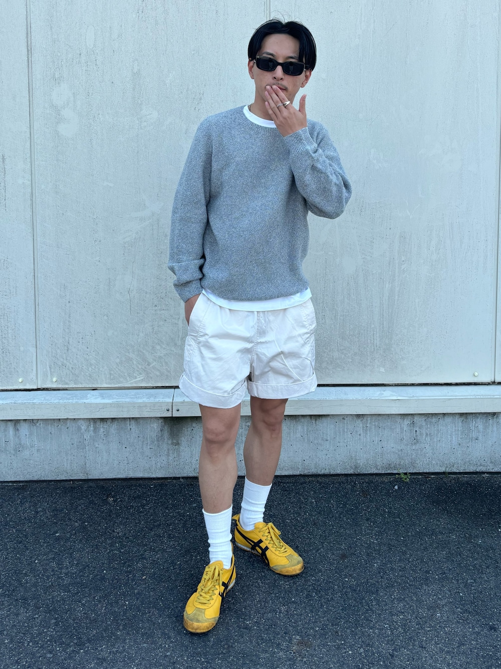春っぽい色味で、メインはスニーカー 気分でハーフパンツは膝上にしたかったので、 ロールアップしてます