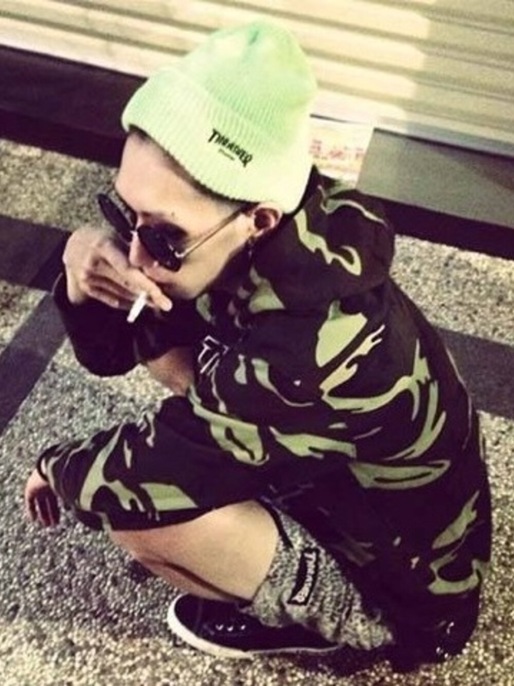 All by THRASHER Cap: Thrasher x Jouetie Hoodie: Thrasher Pants: Thrasher x Advantage cycle Shoes: Thrasher x Converse