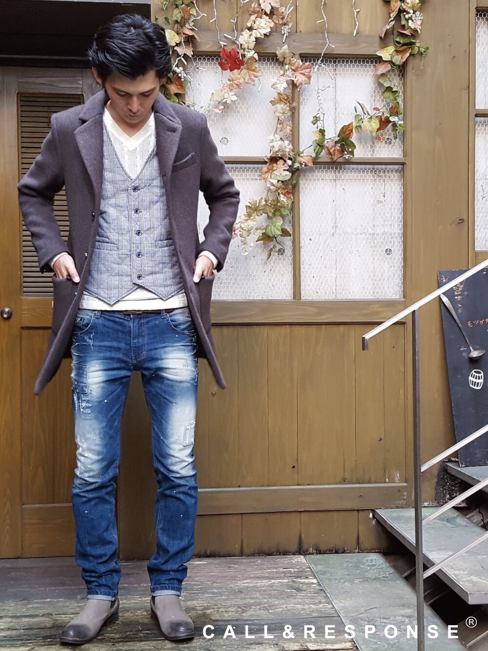 モードスタイルにも使える加工感。ロングコートにストレートラインのデニムを合わせ、縦のバランスで魅せる。