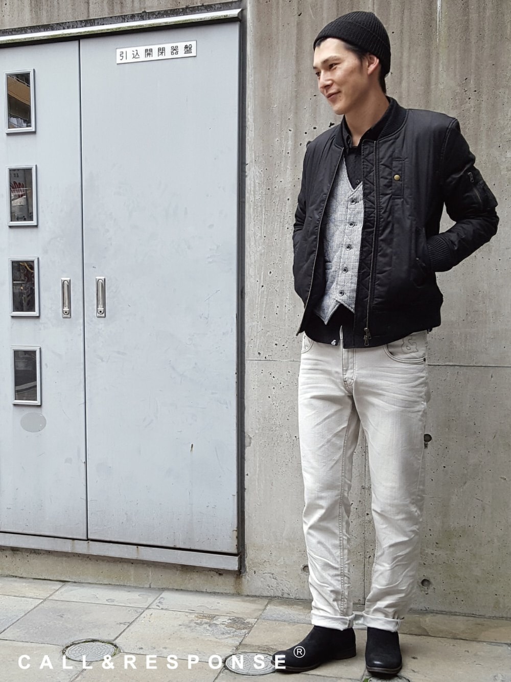CALL&RESPONSE Press room テーマ【ライトアウター×アウター】 清潔感+遊び心+機能性 無骨コーデの鉄板、フライトジャケットには敢えてシャツをインナーにし、やんちゃ感を払拭。 ベストを一枚挟むだけでワンランク上のコーデに! ベストもシンサレート™を使用した軽くて暖かい優れもの!