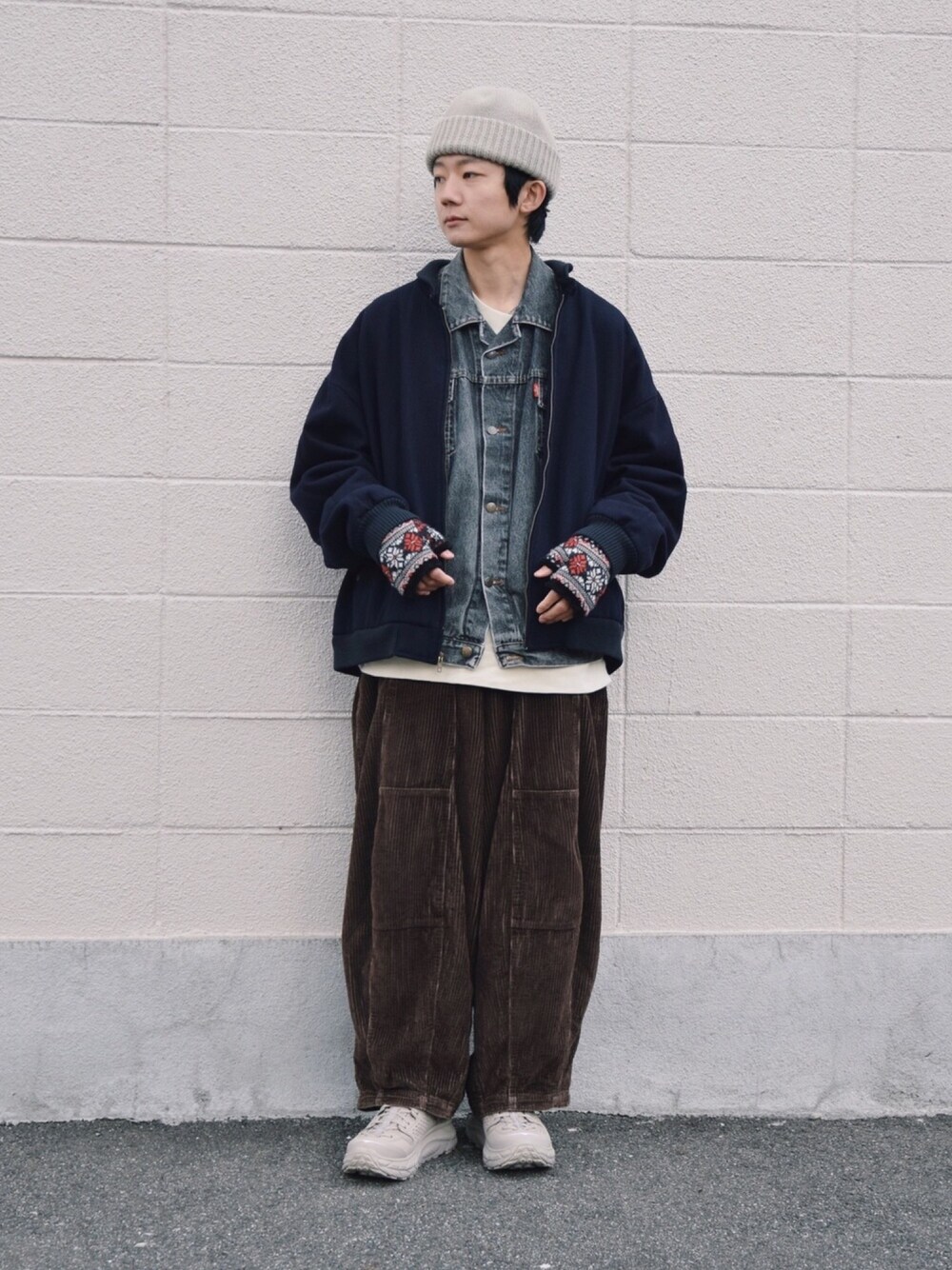 前回のコーディネートからアウターと靴を変えただけ😏 帽子とジージャンの中のスウェットと靴をベージュにしてまとめました。 全体は落ち着いたトーンで、手袋とジージャンのタグの赤をアクセントにしてます。 ちなみに手袋は6年前くらいのレイジブルー 赤はやっぱりいい。何周してもやっぱり赤は好きです。ブラウンにも合うからおすすめ! インスタもよろしくです。 【calm_ngt⠀】
