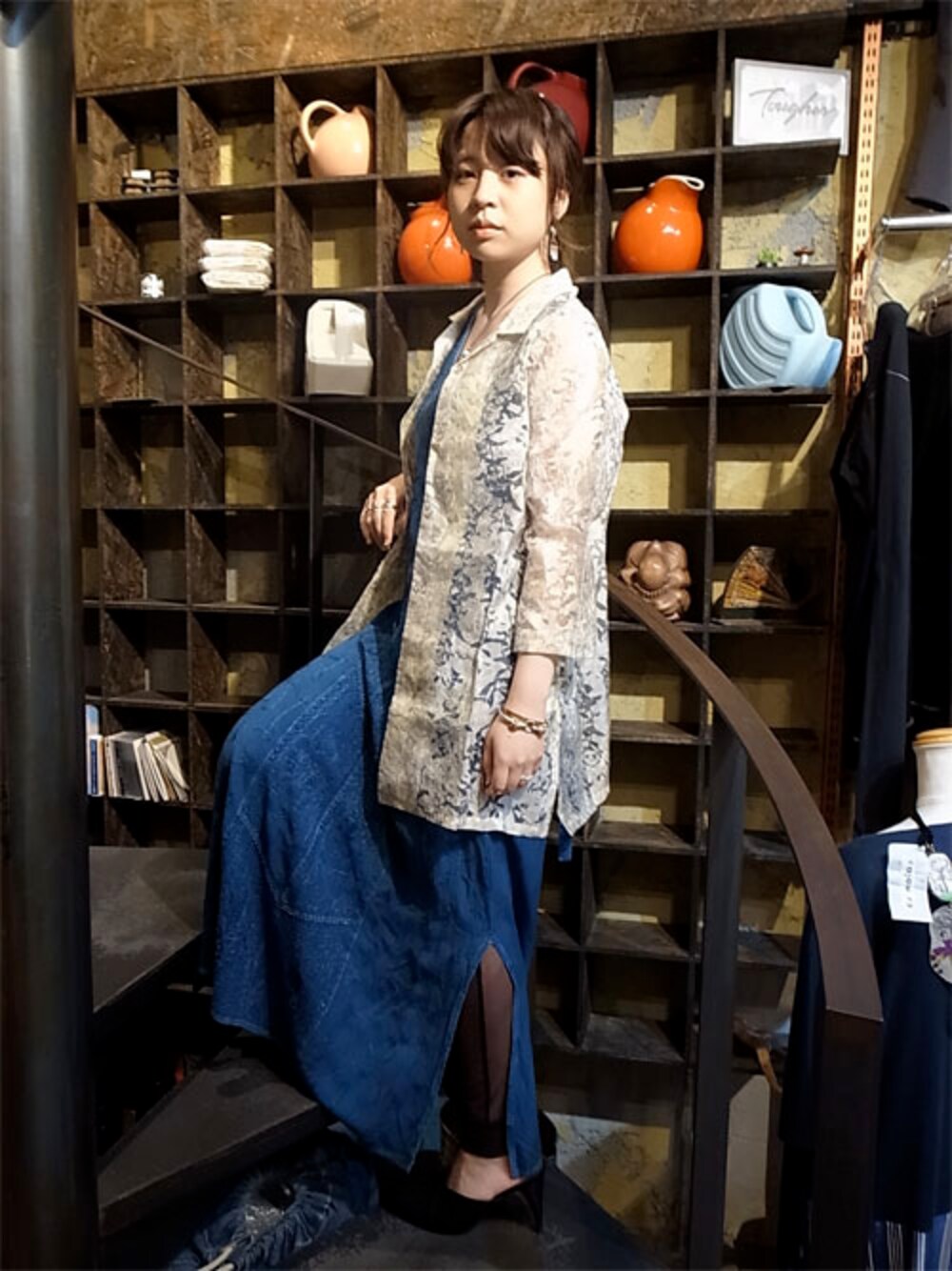 裾にがっつり入ったスリットがスーパーセクシーなエスニックワンピースです。 外での撮影ではないので若干足元など見えにくいのが悔しいですが・・・ スーパーかわいいということは確かです。 とろみのある生地感で歩く度スリットから足がのぞく様がいとをかし。 イメージとしてはアオザイとか、そういう部類の色気のある民族衣装を連想させるスタイルかと。 シースルーの総柄シャツもほどよく肌を透けさせてこれからの季節活躍しそうです。 少しぱりっとした生地感が清潔感もあり◎! One Piece: Ethnic O/P (BLU) Outer: See-Through SH Shoes: Heel Sandal "CoSTUME NATIONAL" Neckless: COMET necklace (amazonite) Model: taro