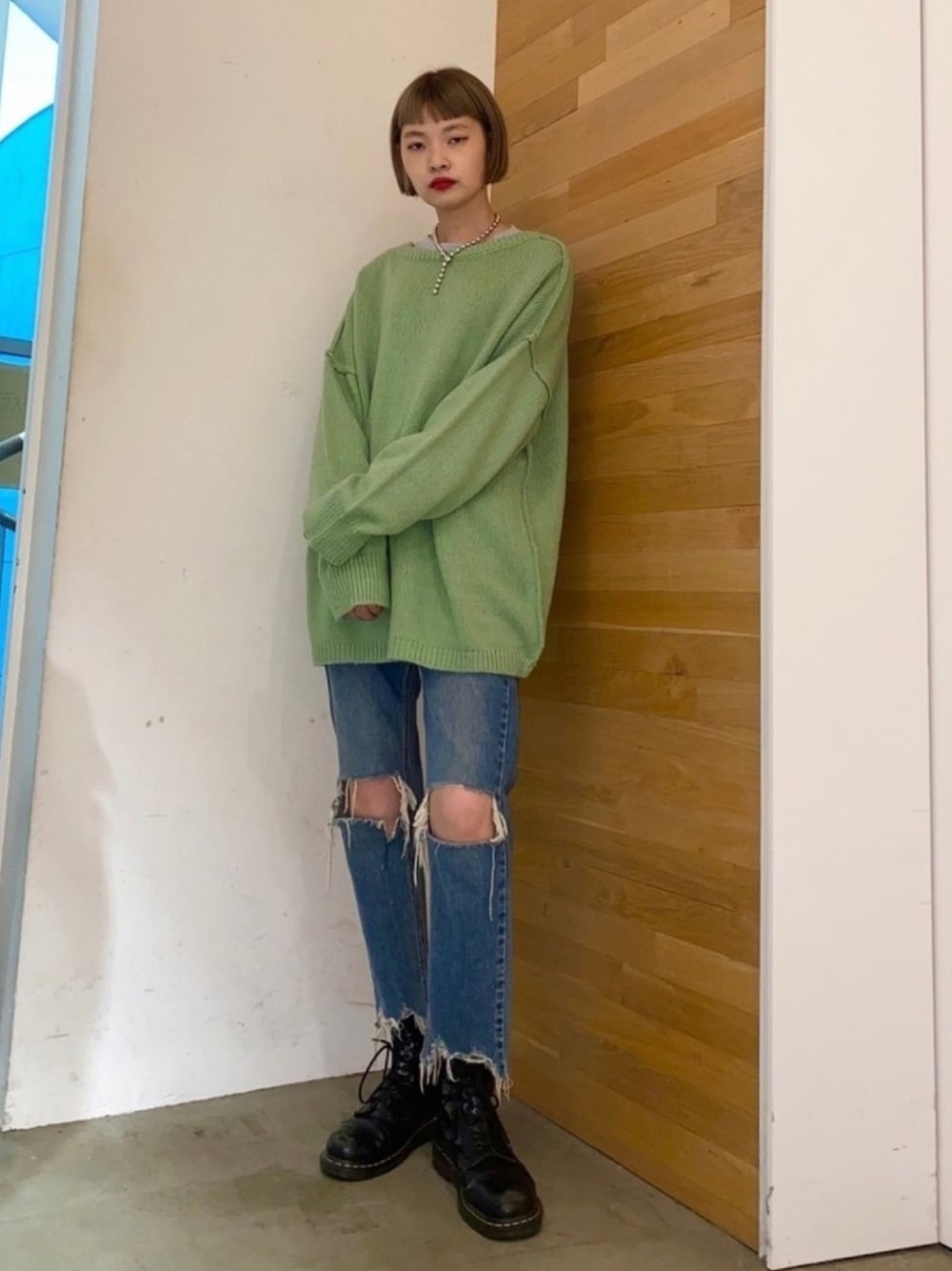 ピスタチオグリーンのルーズなニットは、 デニムと合わせてゆるカジュアルスタイル