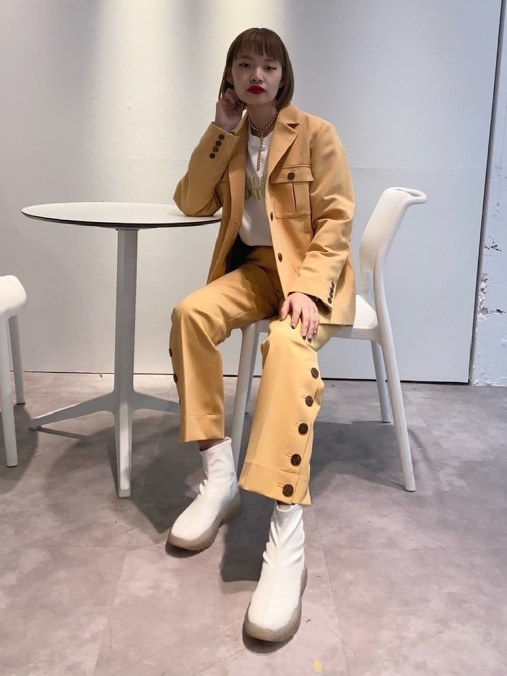 オレンジのセットアップ キャッチーでかわいい。 ディテールはレトロなかちっとしたスタイル。