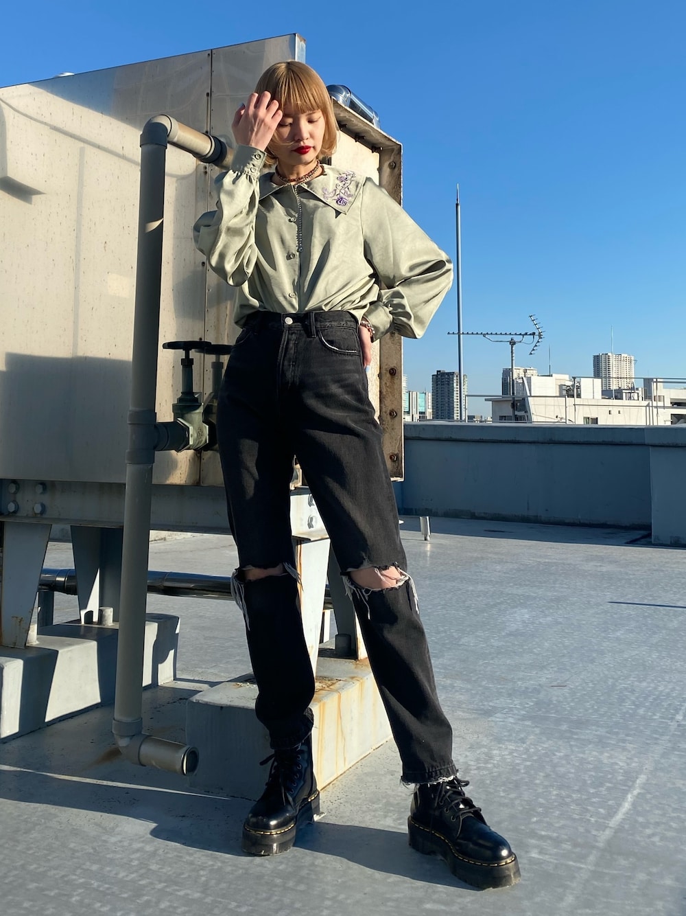 トレンドのビッグカラーに刺繍をあしらったデザイン。 デニムと合わせて甘すぎずカジュアルな印象に。