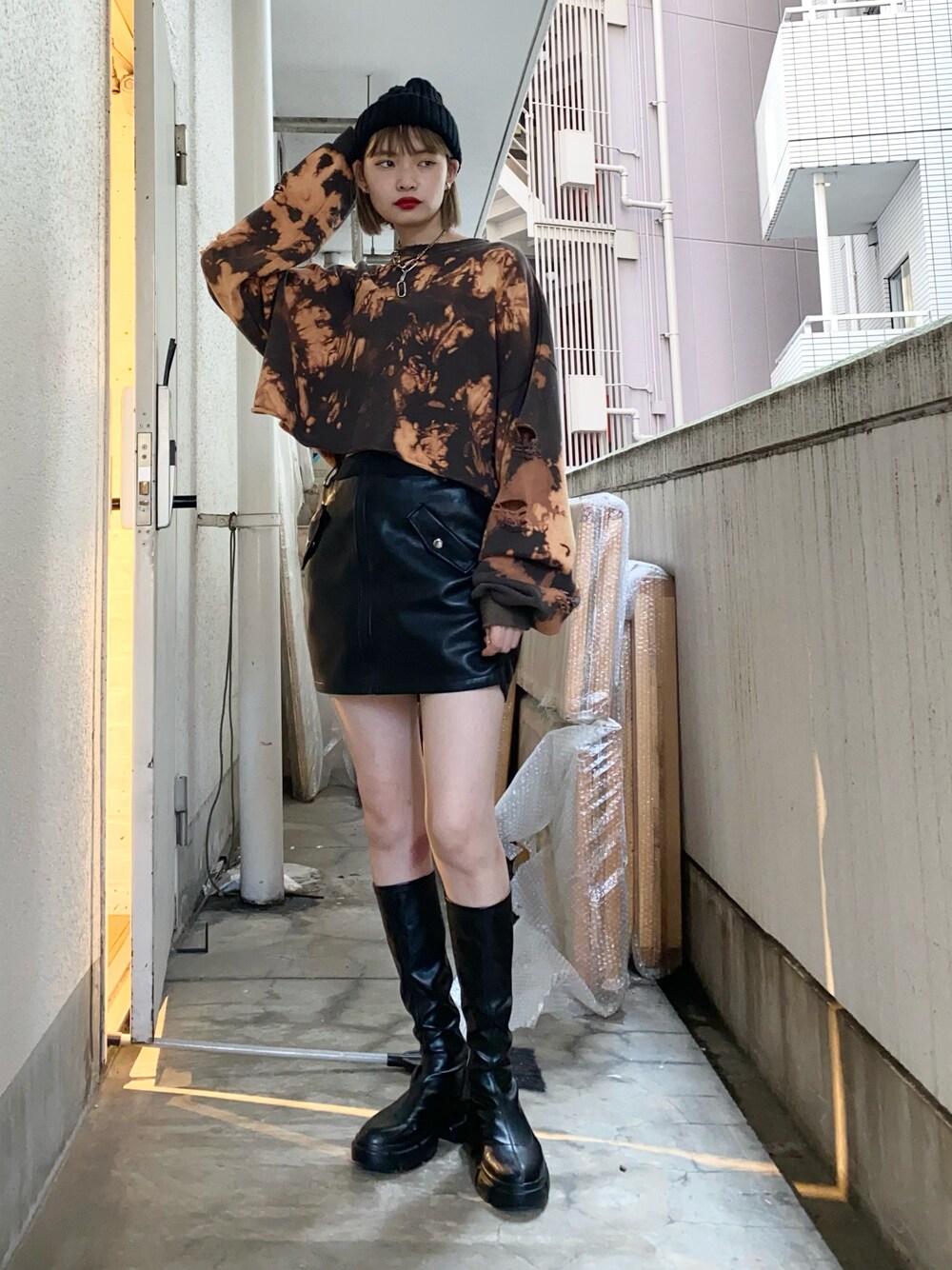ストリートな雰囲気の ダメージ加工のプルオーバーは タイトめなスカパンやロングブーツで 女性らしくスタイリング