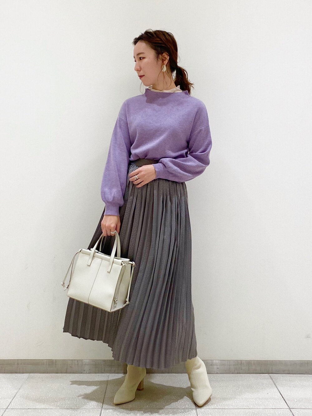 パーソナルカラーニットのパープルは華やかな印象ですが、肌馴染みがよく挑戦しやすいカラーニットです。 シアーインナーをチラ見せするとメリハリのあるコーデに仕上がります。 グレースカートを合わせてシャープな大人ワントーンコーデに。