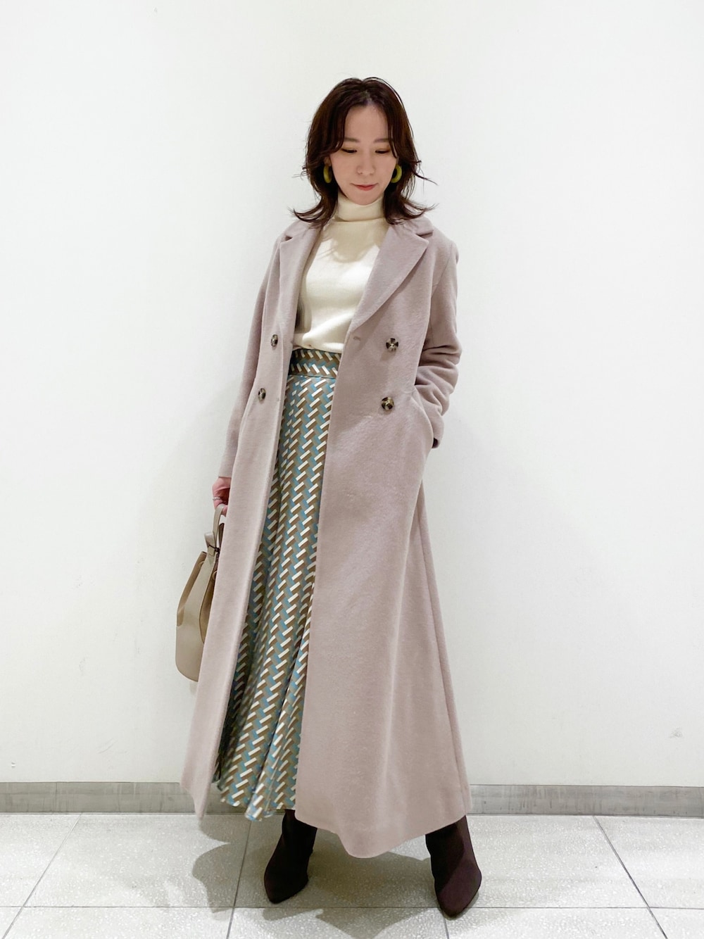 ロングのウールチェスターコートが入荷しました! くるぶし丈のマキシロングが今年らしく、すごく軽く柔らかい着心地なので長くてもストレスフリーで着て頂けます。 ウエスト周りはすっきりとフィットし、ボタン位置も高めにあるので150cm前半くらいの身長の方でも着られます。 少しピンクがかったベージュのカラーで馴染みよく、より上品な印象に仕上がります。