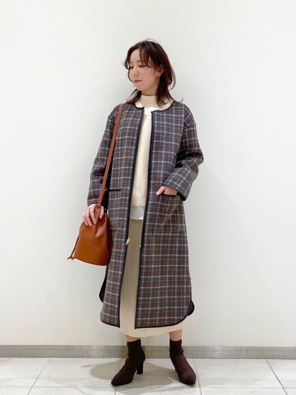 リバーシブルコートの着回しコーデです。 ざっくりと抜け感のあるシルエットのコートですが、ハリのある素材によりすっきり見え着膨れせずに着ていただけます。 チェック柄コートは中をシンプルにセットアップを合わせて大人カジュアルスタイルに、、、