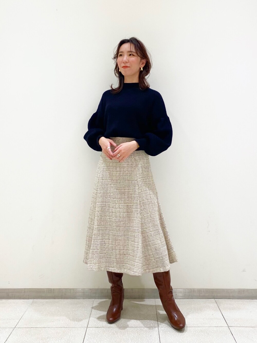 新作のツイードスカートはしなやかな素材で揺れ感も女らしく上品な印象に。 ウエスト周りは細身でお腹周りがすっきり引き締まって見えます! まだ寒い冬のシーズンはロングブーツ合わせで、大人フェミニンコーデがオススメです◎
