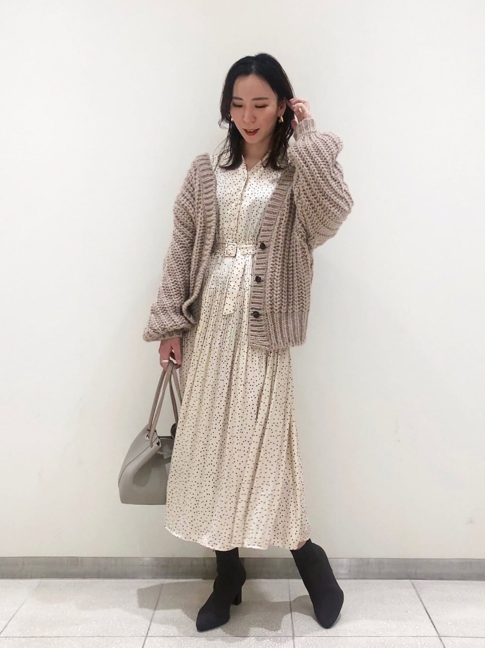 上品な印象のサテンワンピースは、ゆるカーデを合わせて大人カジュアルなコーデに♡ ワンピはさらっと軽やかな素材なので、動いた時の揺れ感も◎◎