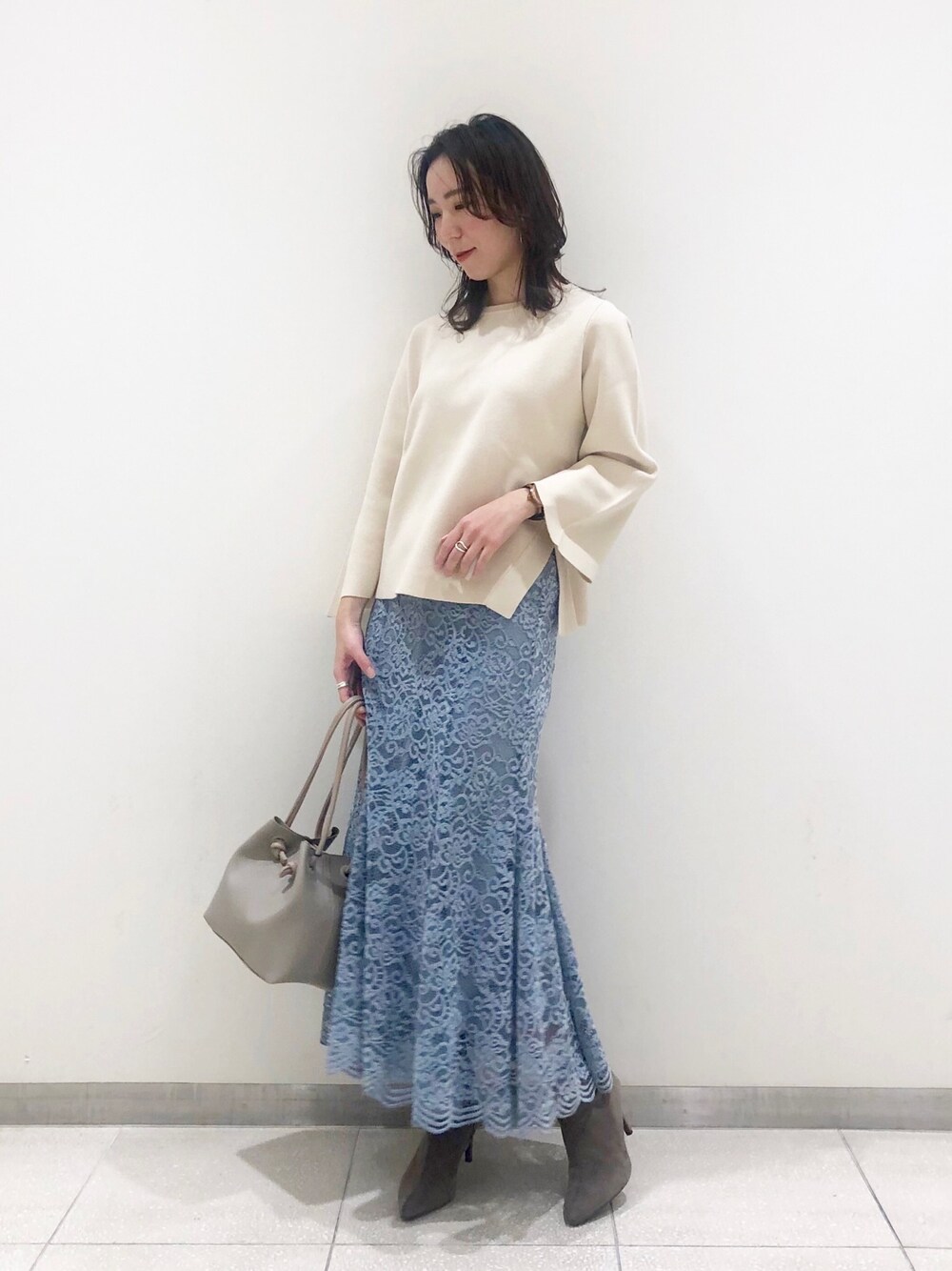 顔診断のニットを使ったコーディネートです♡ 袖口の斜めのカッティングやサイドのスリットがシャープな印象を与えて、直線タイプのお顔立ちをより引き立たせてくれます◎ 今回はレーススカートと合わせて大人可愛いスタイリングにしてみました⭐︎