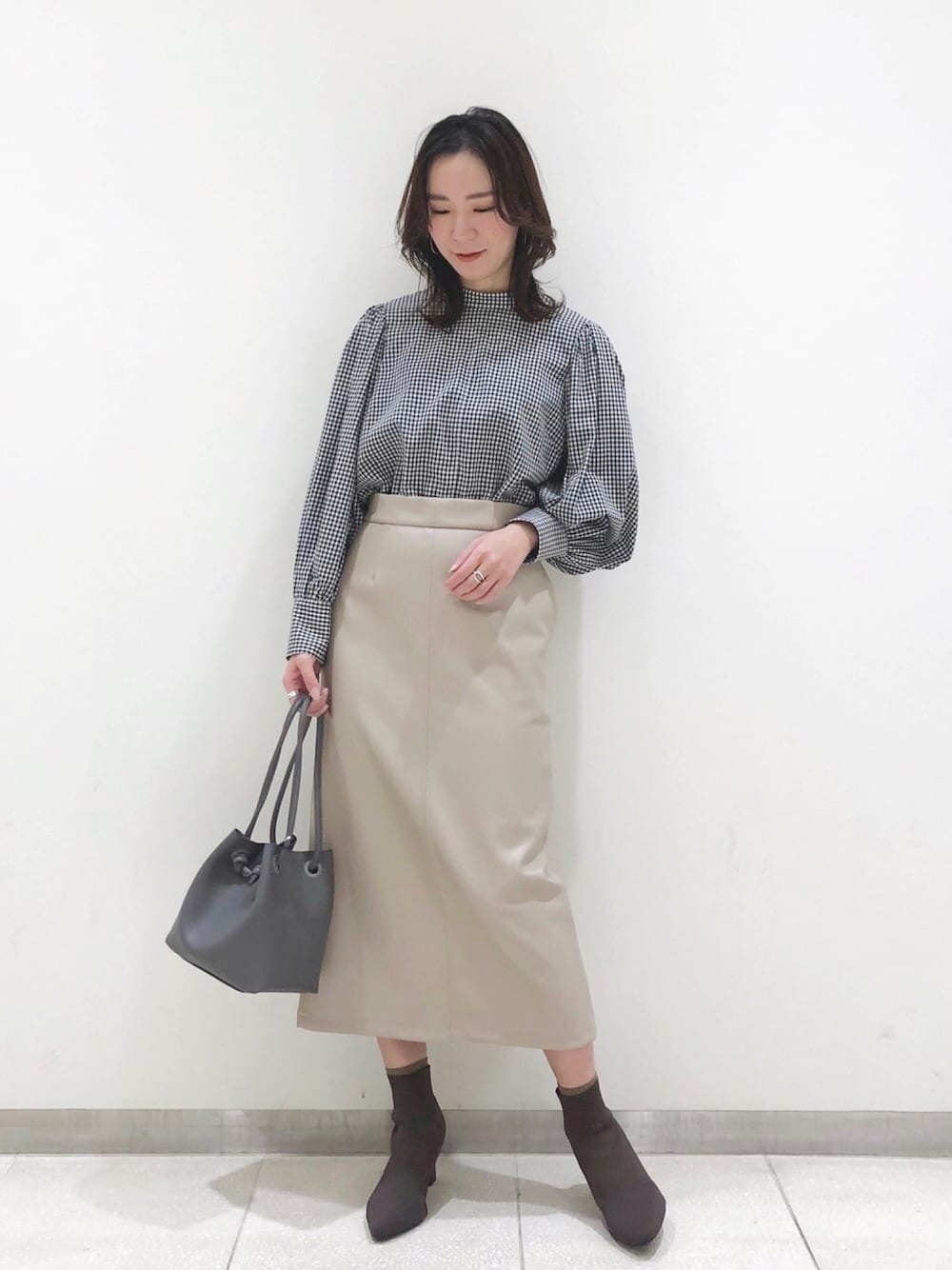 ガーリーなチェックブラウスをモノトーンでまとめて、シックなスタイリングにしました。 春の定番ギンガムチェックもレザーアイテムと合わせることで、今年らしい旬なコーデになります☺︎