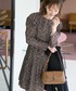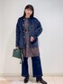 ネイビーとブラウンの相性とドロップショルダーの毛足の長いカーディガンが可愛らしさを引き立てつつ甘すぎないコーディネートです✴︎