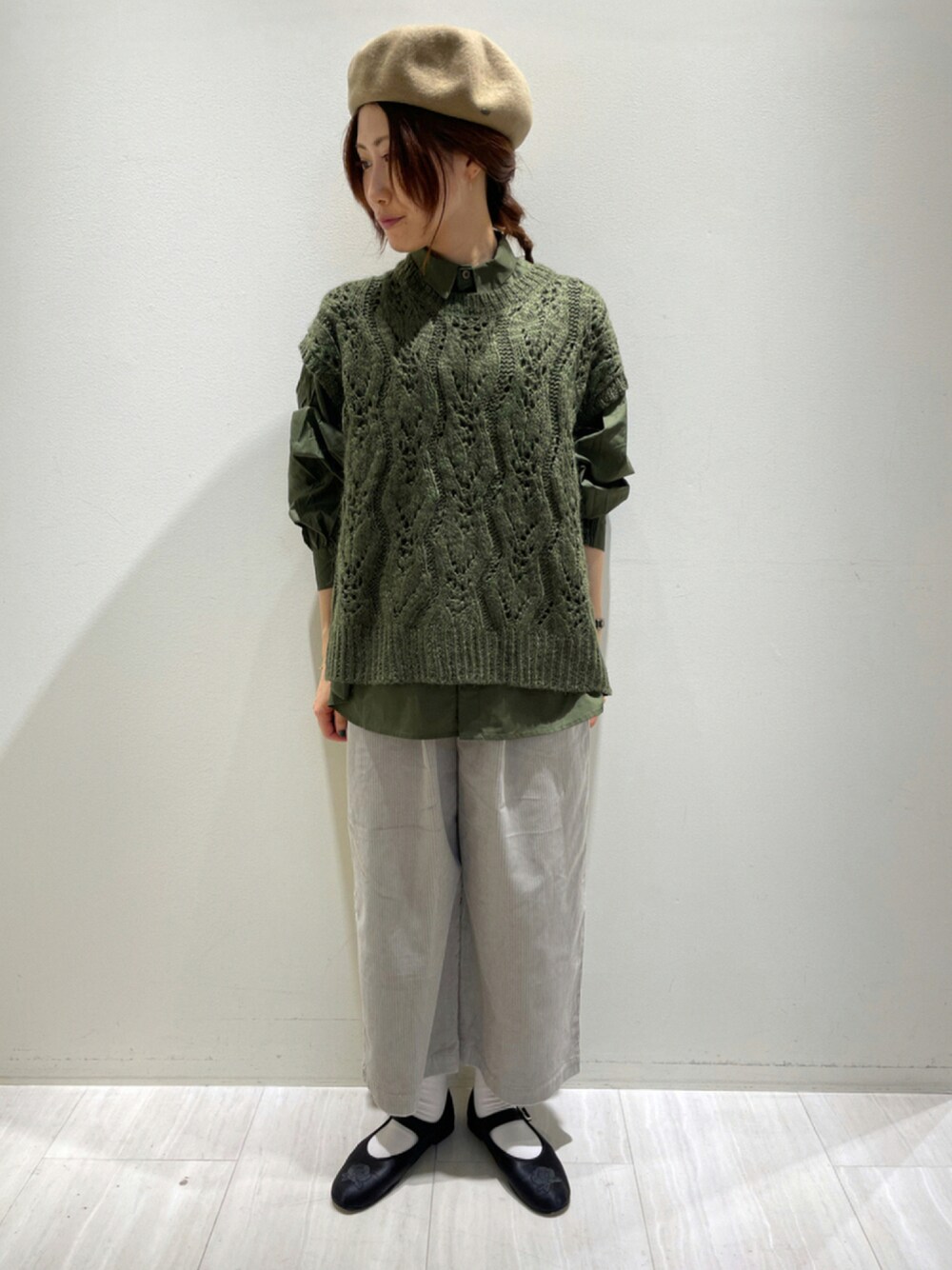【sm2rhythm】 トップスのはっきりとしたオリーブ色とパンツの 淡いグレーのようなミント色の寒色組み合わせが 秋冬の重い装いのイメージを刷新してくれるコーデ。 柄編みが華やかさをプラスしてくれるベストはアルパカ混で ふわりと軽く柔らかくて暖かいので活躍間違いなしです🦙 〈No.294〉