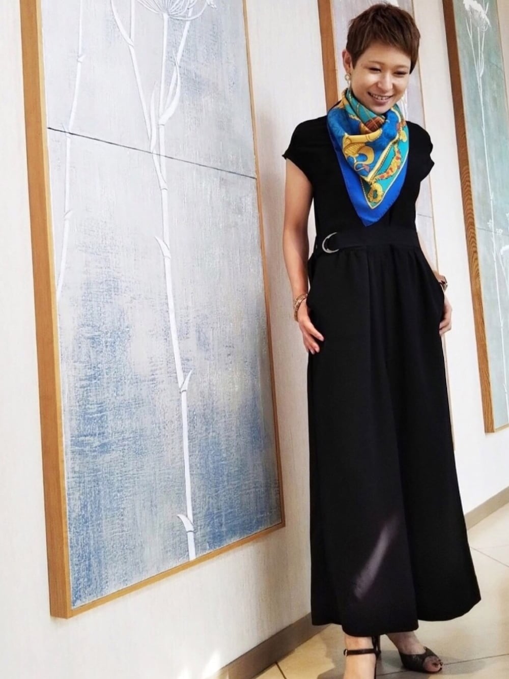 フォーマルな場だったので、ブラックのオールインワンで! ブルーのスカーフで、 大人っぽさと華やかさをプラス!☻ ウェストも上の方で、スカーフで上に視線がいくので、 スッキリと着こなせます!