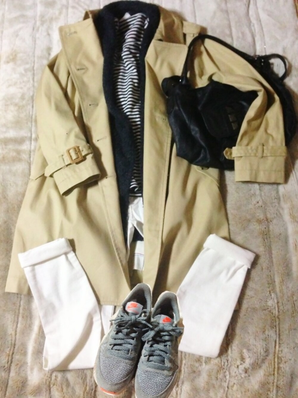 トレンチコート…vis ボーダーTシャツ…x-girl ロングニット…apart by lowrys スキニー…g.u. バッグ…LEPSIM LOWRYS FARM スニーカー…NIKE 夜は寒い…(´Д` )