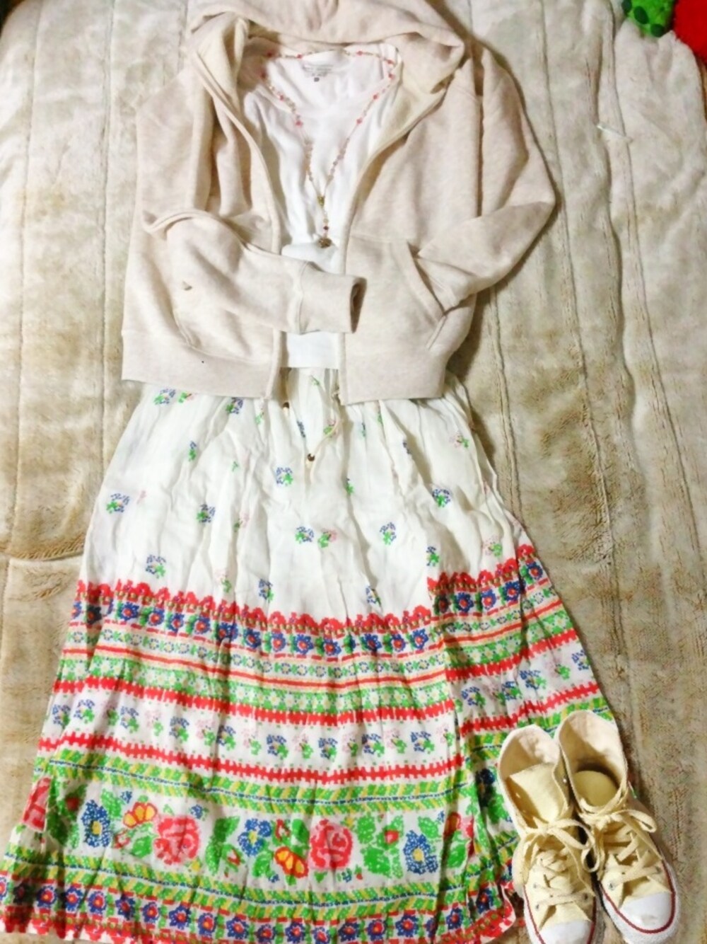 この白というか、生成り色が好き! 春のエスニックというかアルプスの少女コーデ 山を駆け回りたい♡(妄想) お気に入りのロザリオをつけて♪