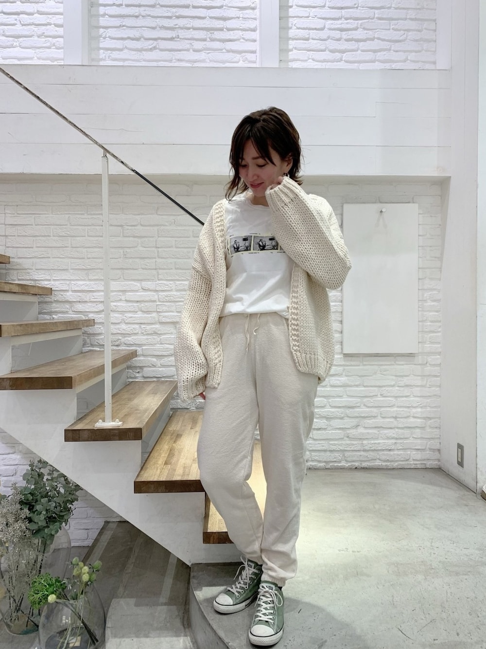 新作のパイルジョガーパンツは期待通りの履きやすさ👏🏻 ワントーンなのでポイントにプリントTをチョイス✧ mayumi
