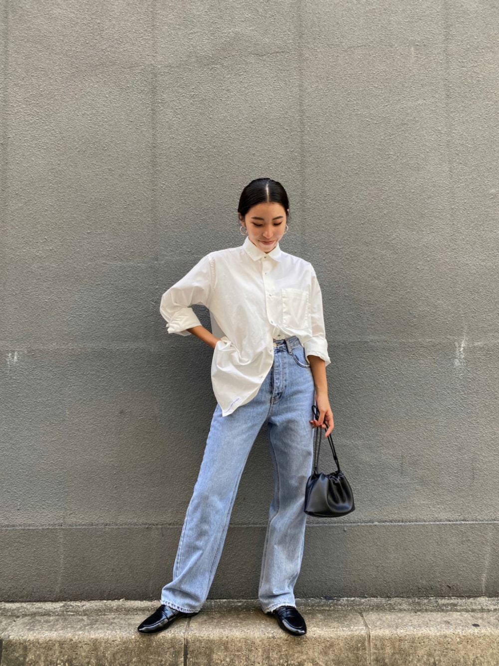この時期一番使えるシンプルシャツ💙 ボタンの下に"OCEANS BIRDS STREET"のロゴが入っていてチラッと見える感じが…◎ このデニムは形が綺麗で、柔らかくて履きやすくて最高です☺️ ANZU/160cm